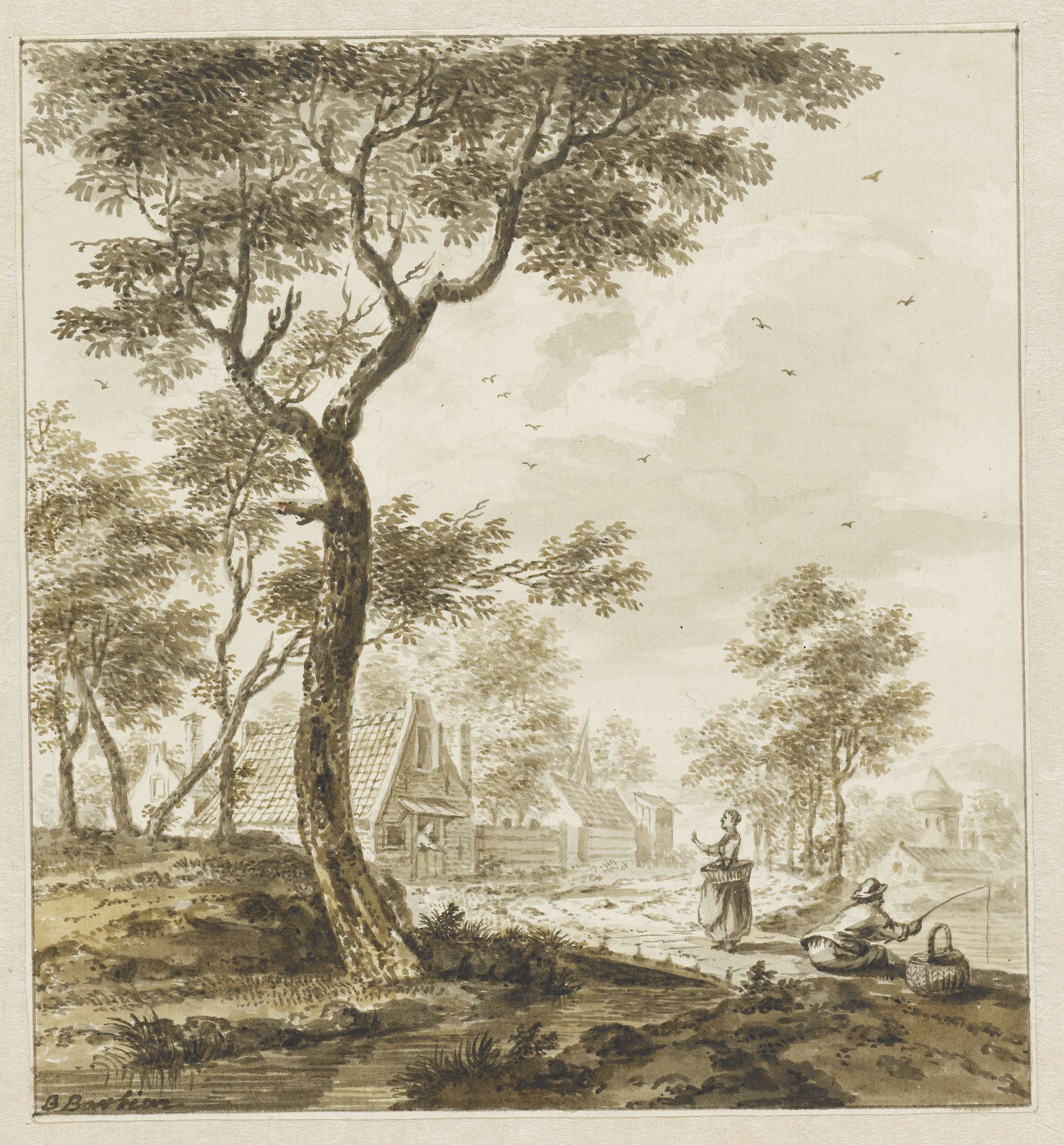 Landschap met figuren en rechts een hengelaar