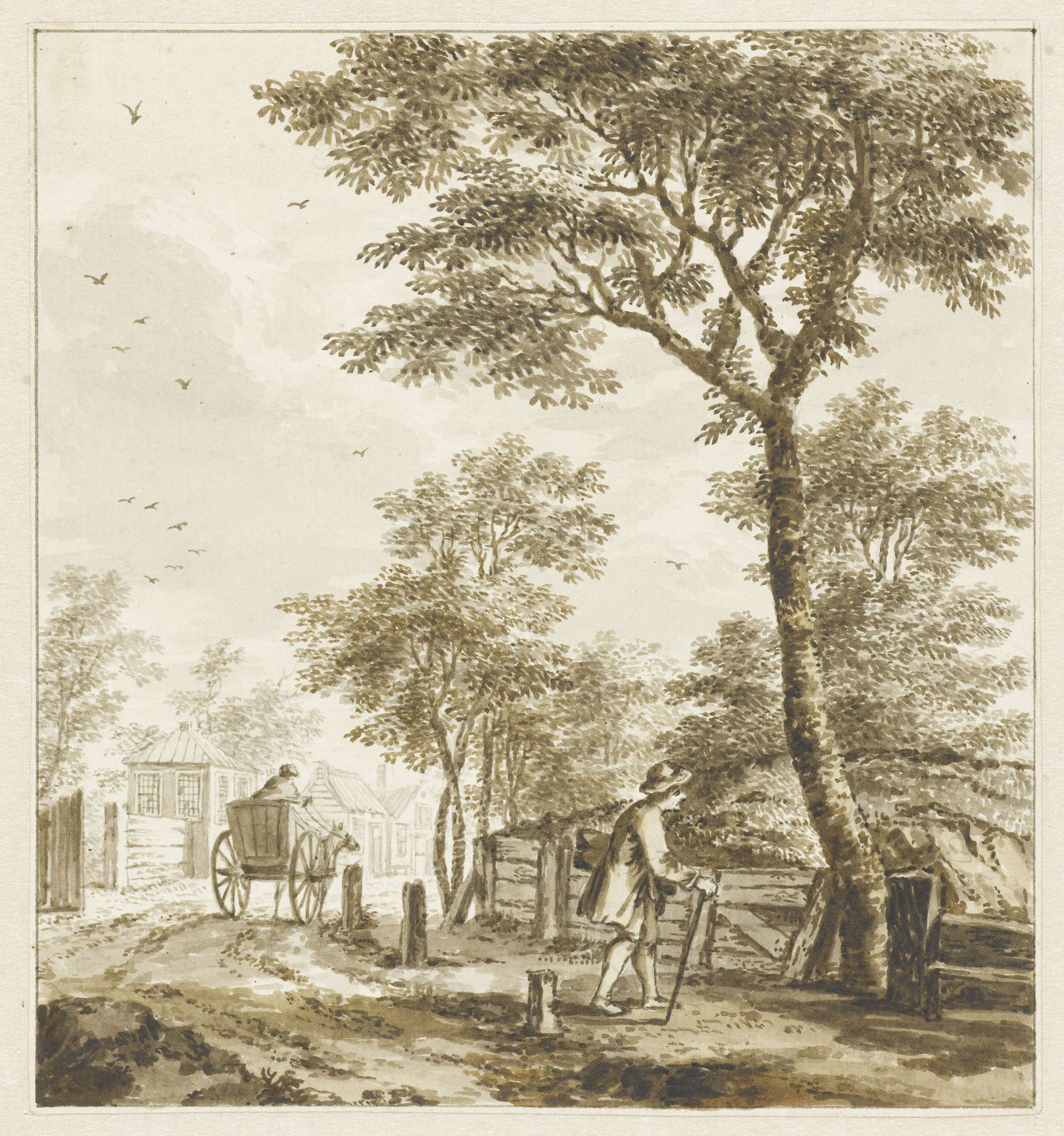 Landschap met figuren en een paard en wagen