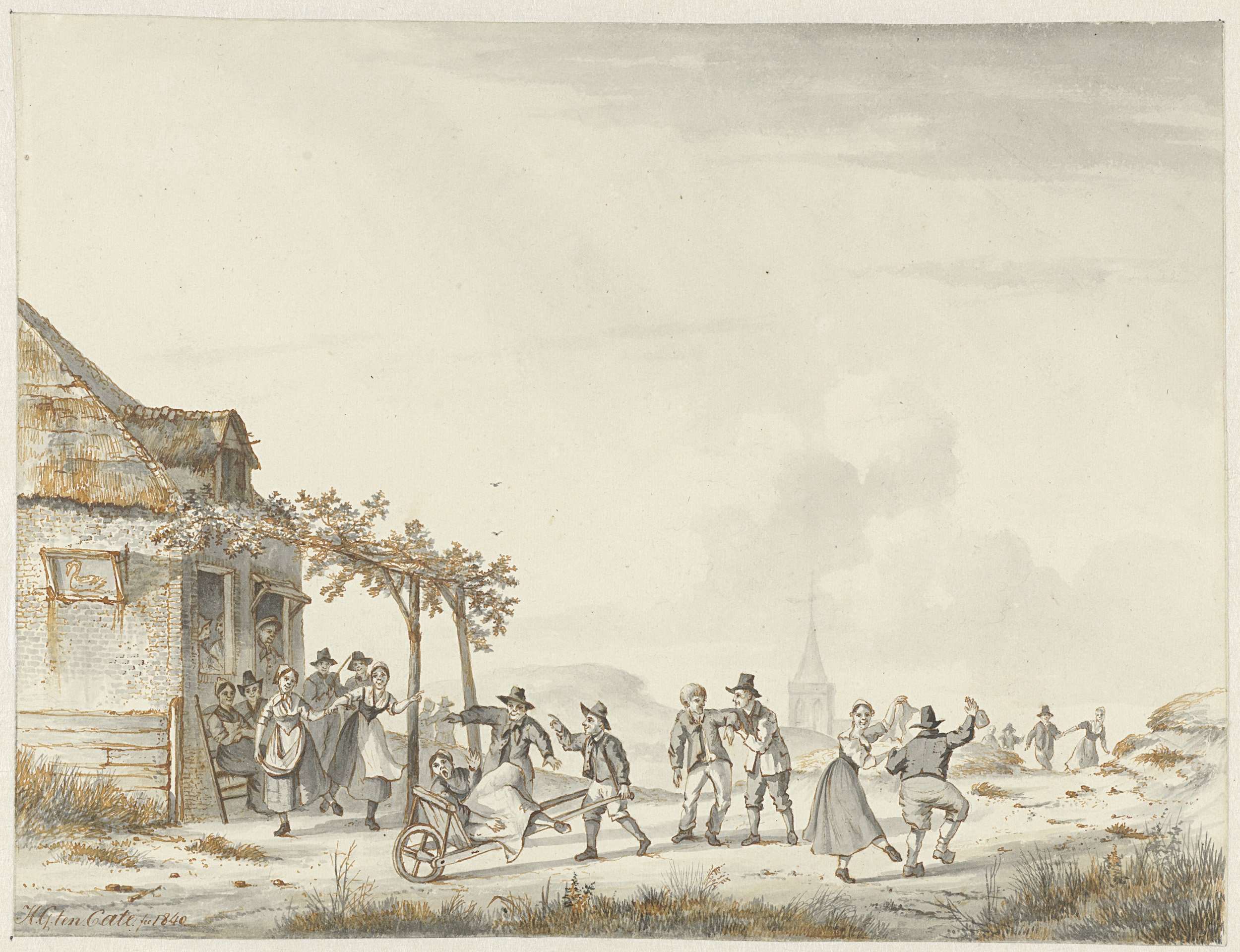 Dorpsfeest bij een herberg aan de duinen