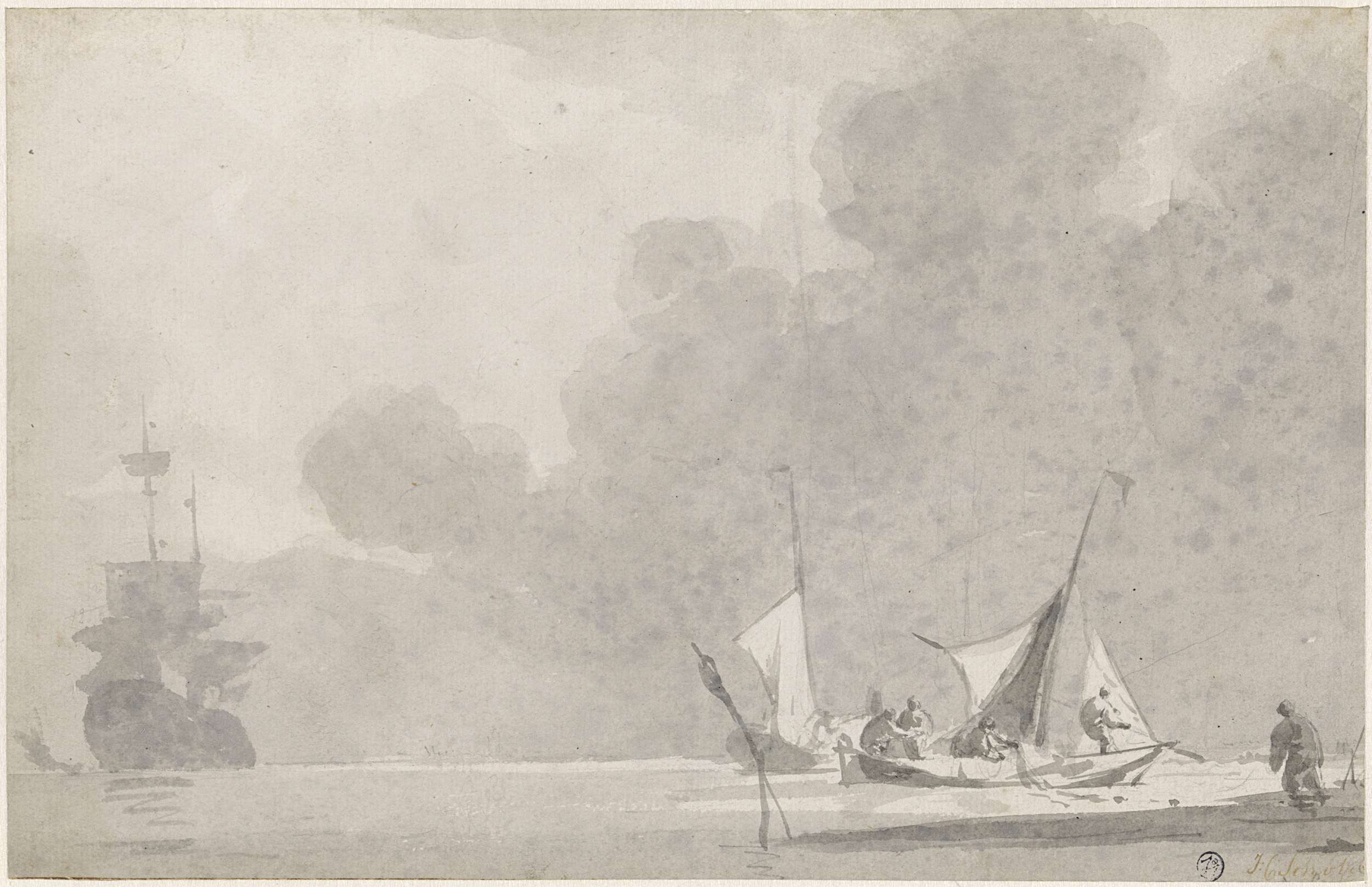 Marine met rechts twee vissersboten, op de achtergrond een tweemaster