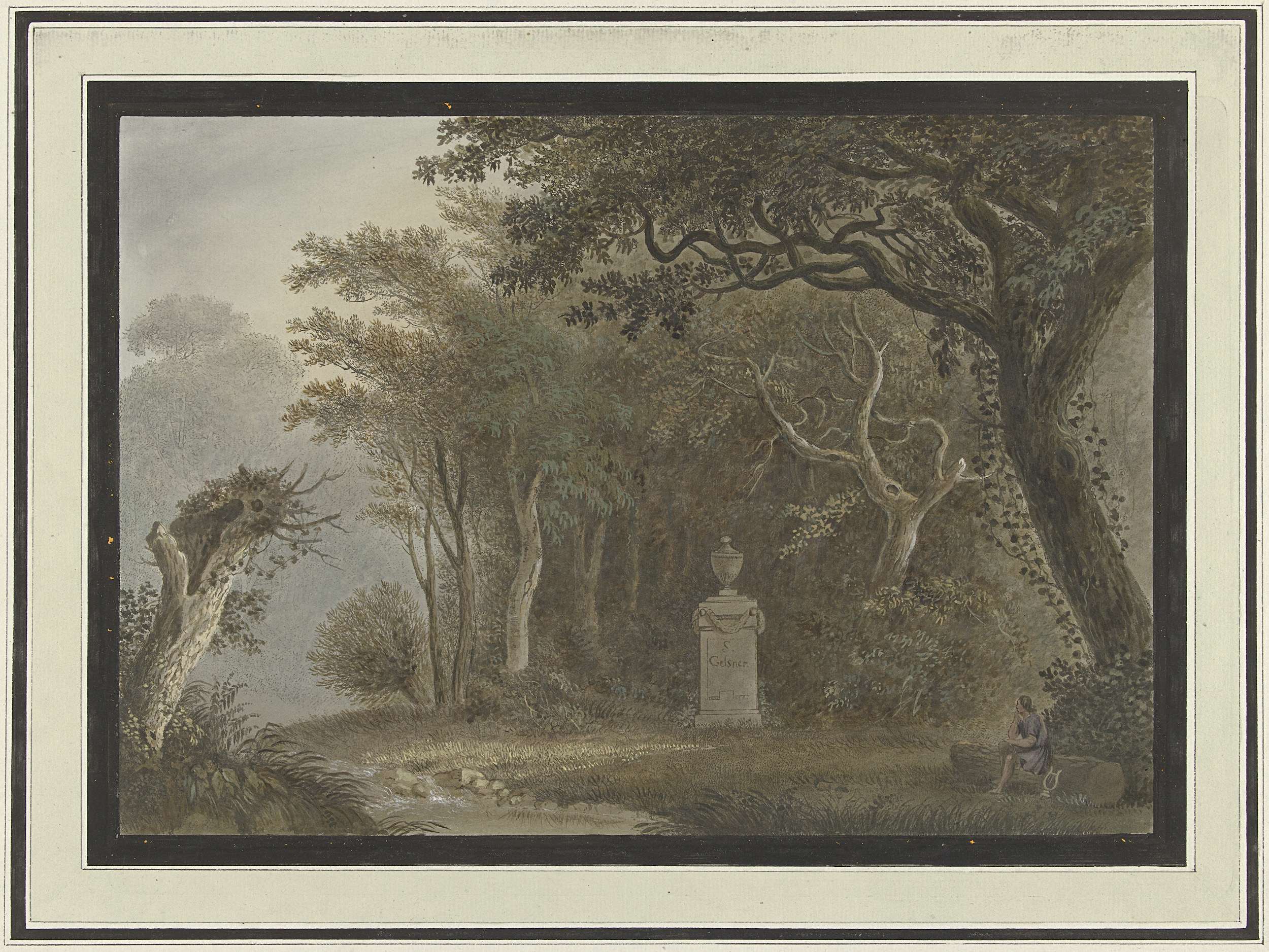 Boslandschap met monument voor Salomon Gessner (1730-1788); rechts op de voorgrond een man met een lier.