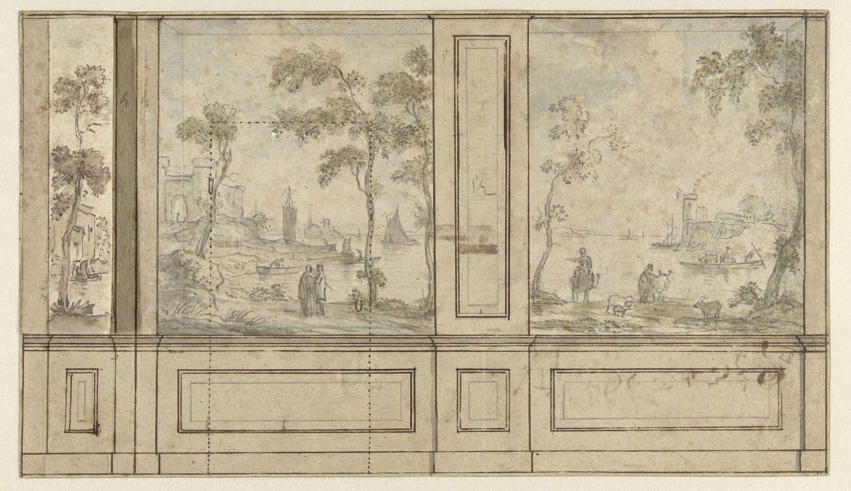 Ontwerp voor kamerwand met drie behangselpanelen, waarvan de linker het smalst.