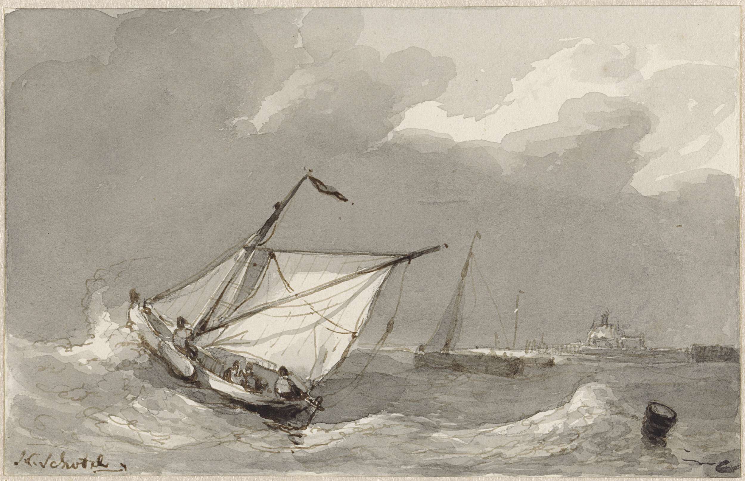 Vissersboot op een woelige zee, met in het verschiet een dorp