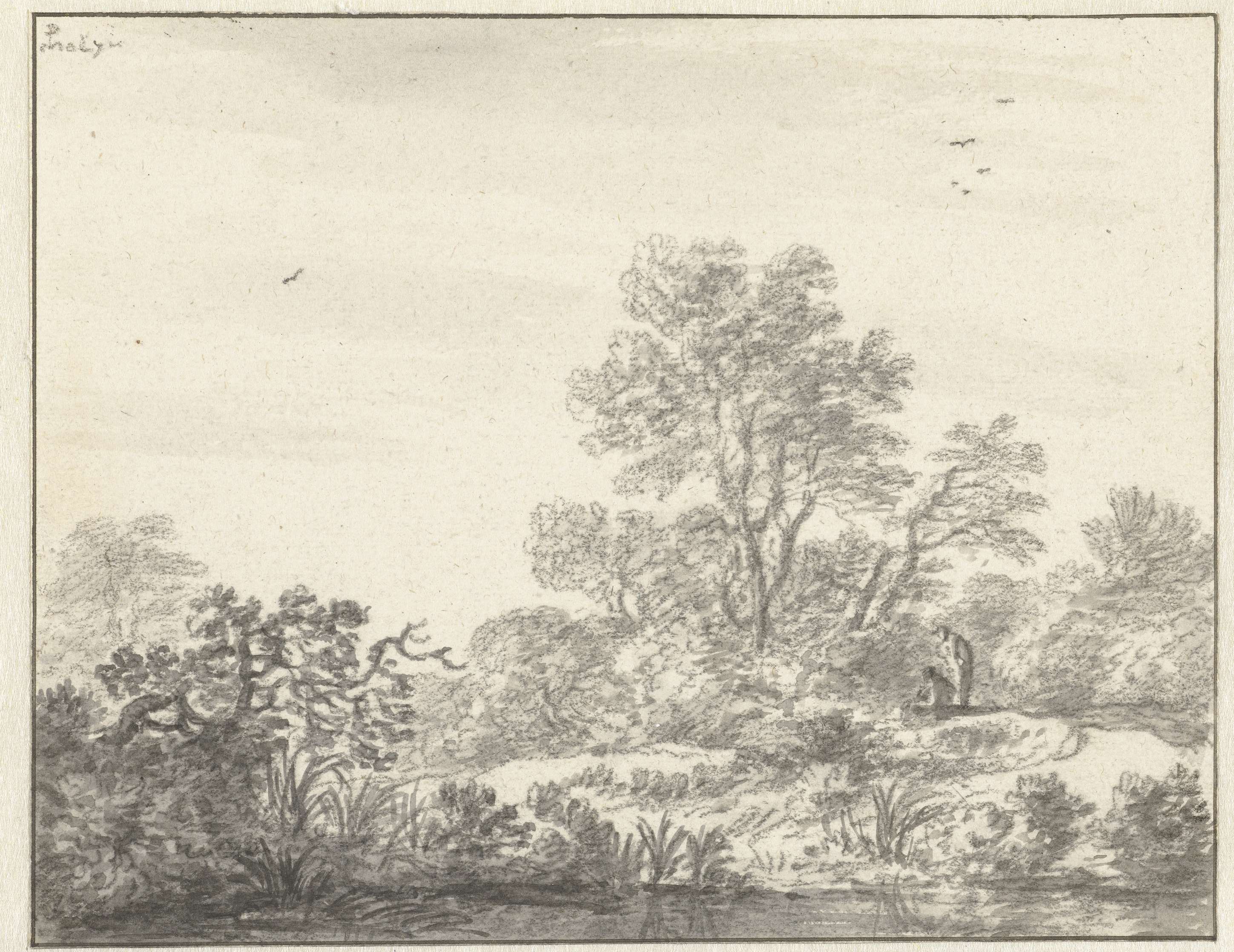 Twee figuren tussen geboomte aan de oever van een water