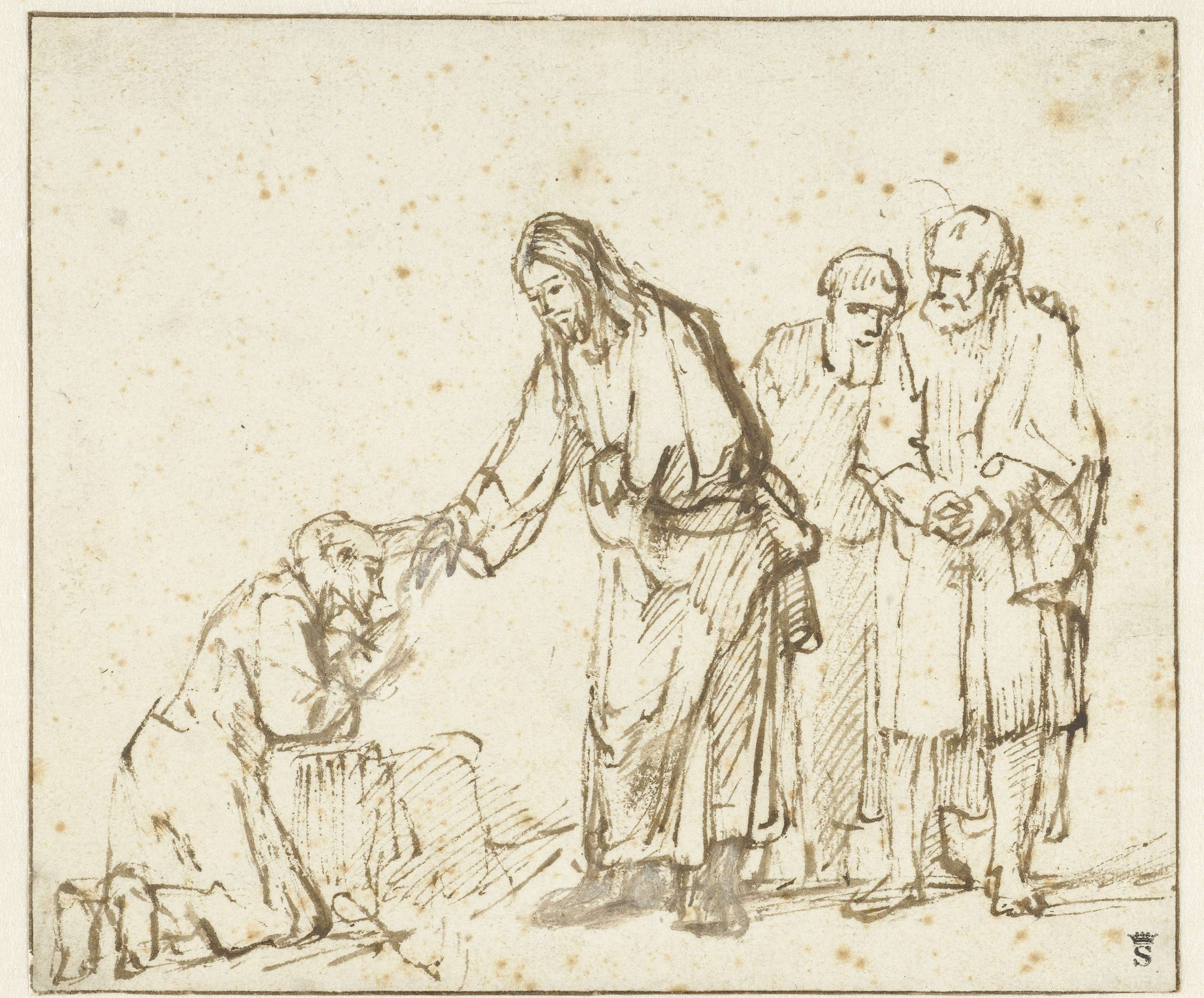Jezus genas een melaatse man enkel door hem aan te raken. Aanvankelijk liet Rembrandt Jezus de hand van de zieke man grijpen. Hij bedacht zich en dekte beide handen af met loodwit, dat met de tijd is geoxideerd. Uiteindelijk liet hij de hand van Jezus betekenisvol rusten op het hoofd van de melaatse. Rechts kijken ...