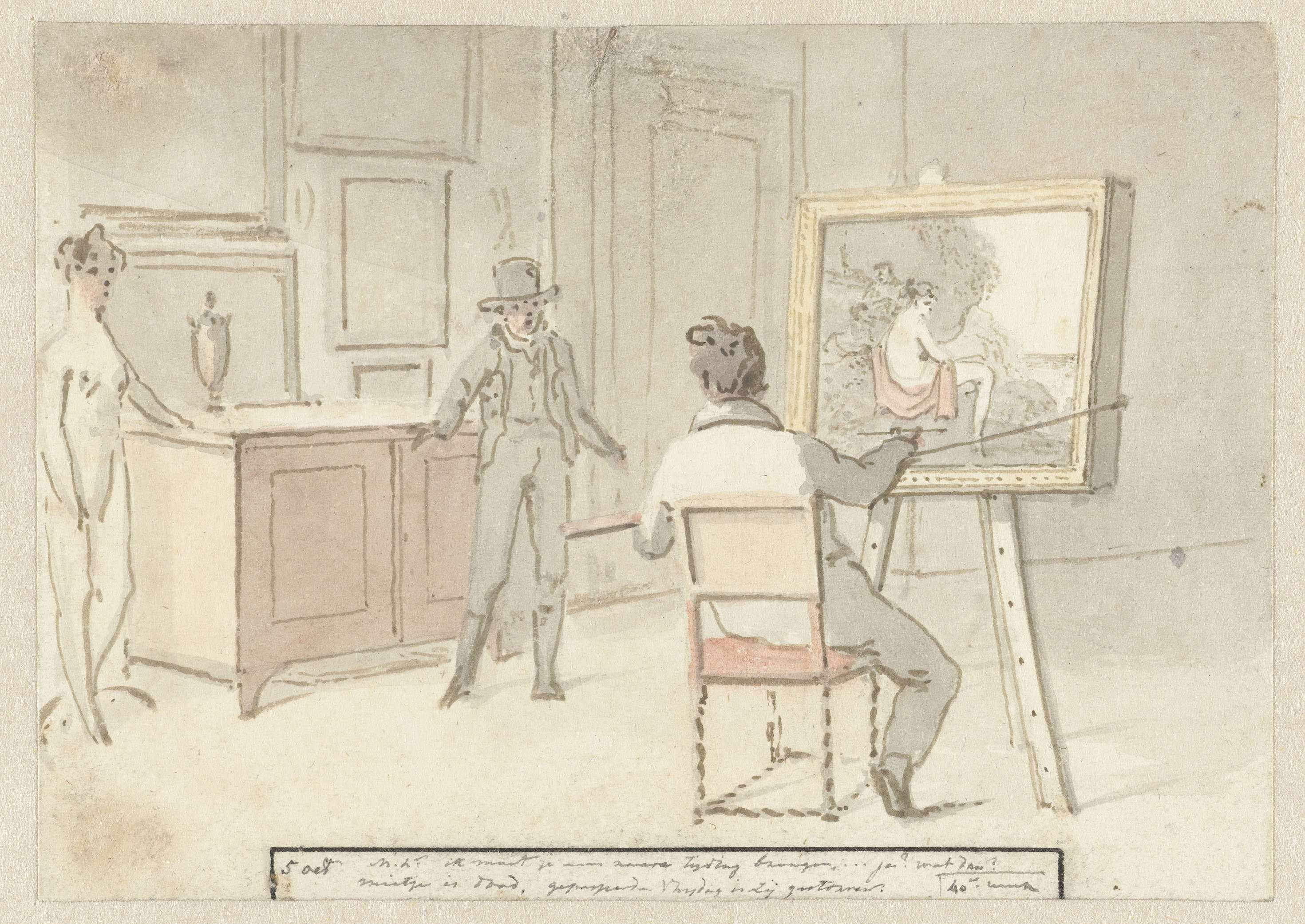 Uit de houding van de boodschapper kan worden afgelezen dat hij ernstig nieuws heeft. Terwijl hij Andriessen inlicht over het overlijden van zijn vaste model Mietje, werkt de kunstenaar aan een figuurstuk, zijn rechterhand leunend op een schilderstok. Voor deze fase van het maakproces is geen model meer nodig, dus er kan niet worden uitgesloten ...