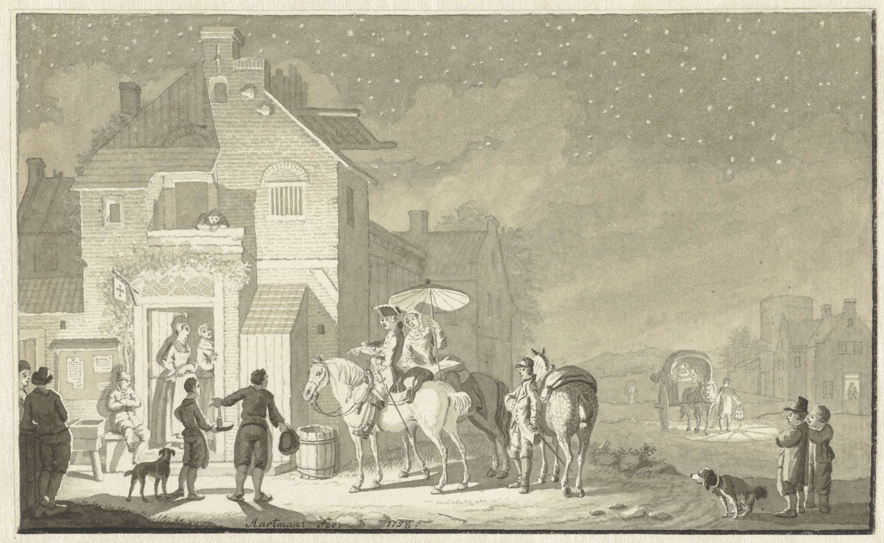 Reisgezelschap voor herberg bij avond