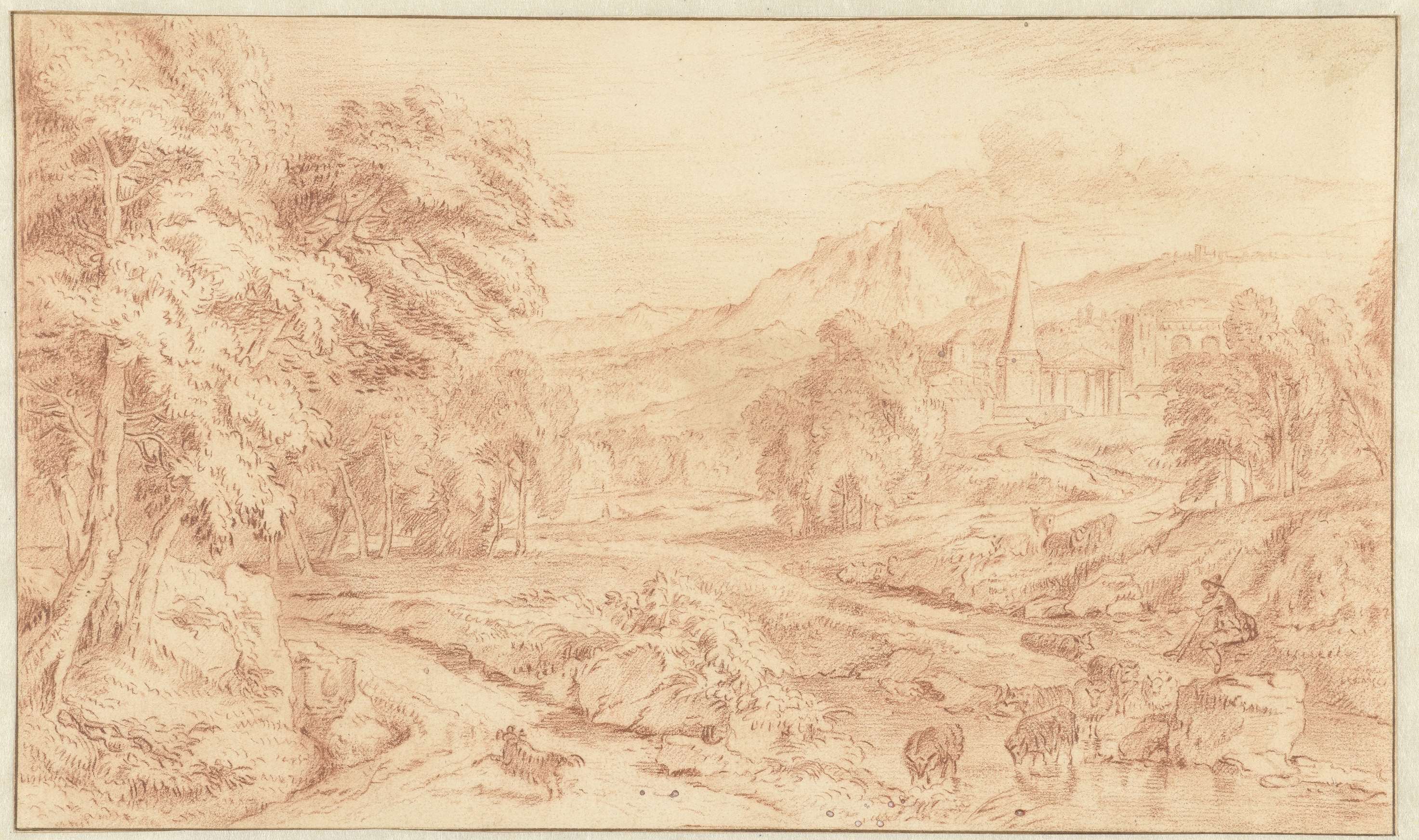 Italiaans landschap met klassieke ruïnes en een schaapherder bij een voorde.