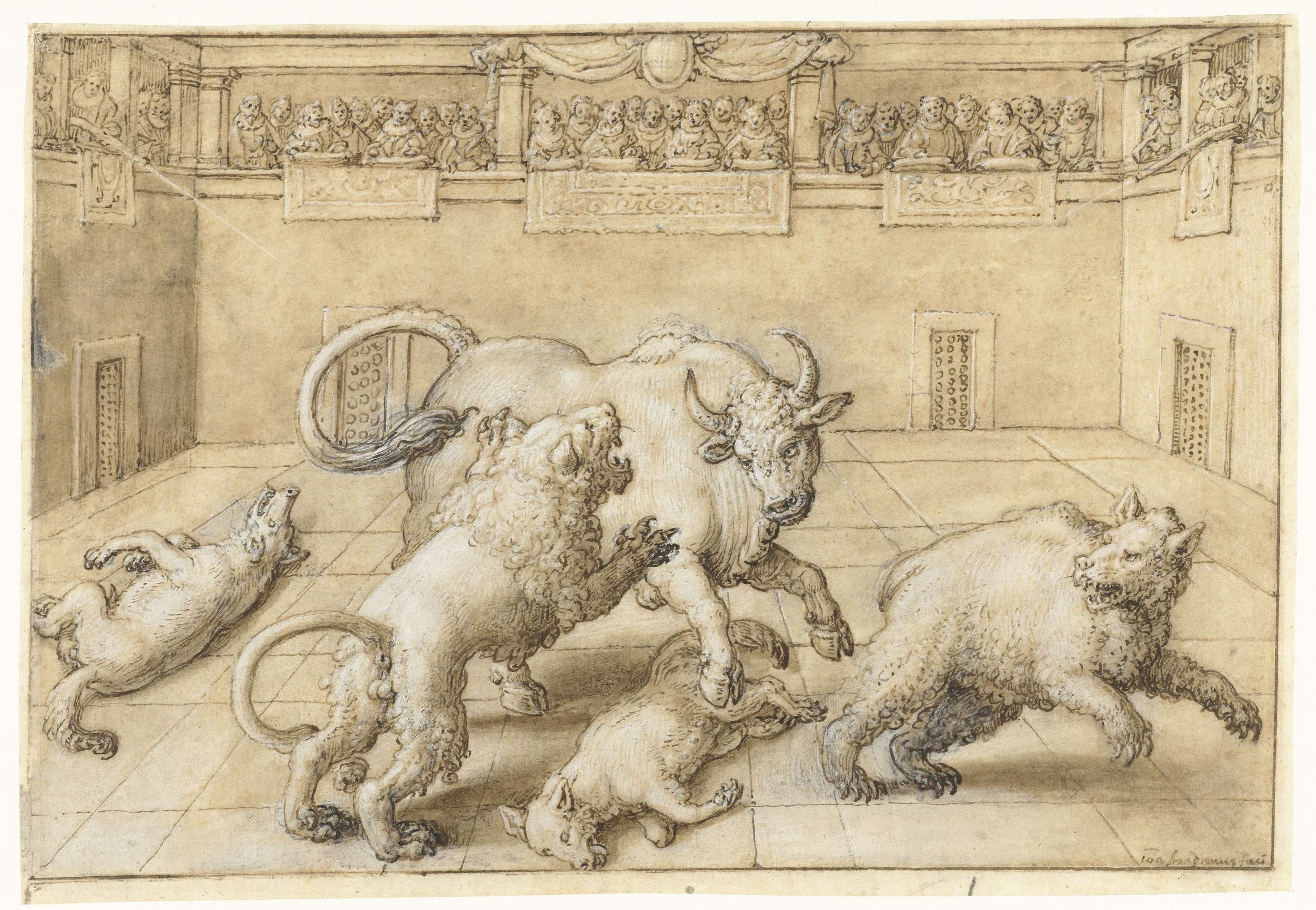 Gevecht in een arena tussen een stier, leeuw, beer en twee wolven