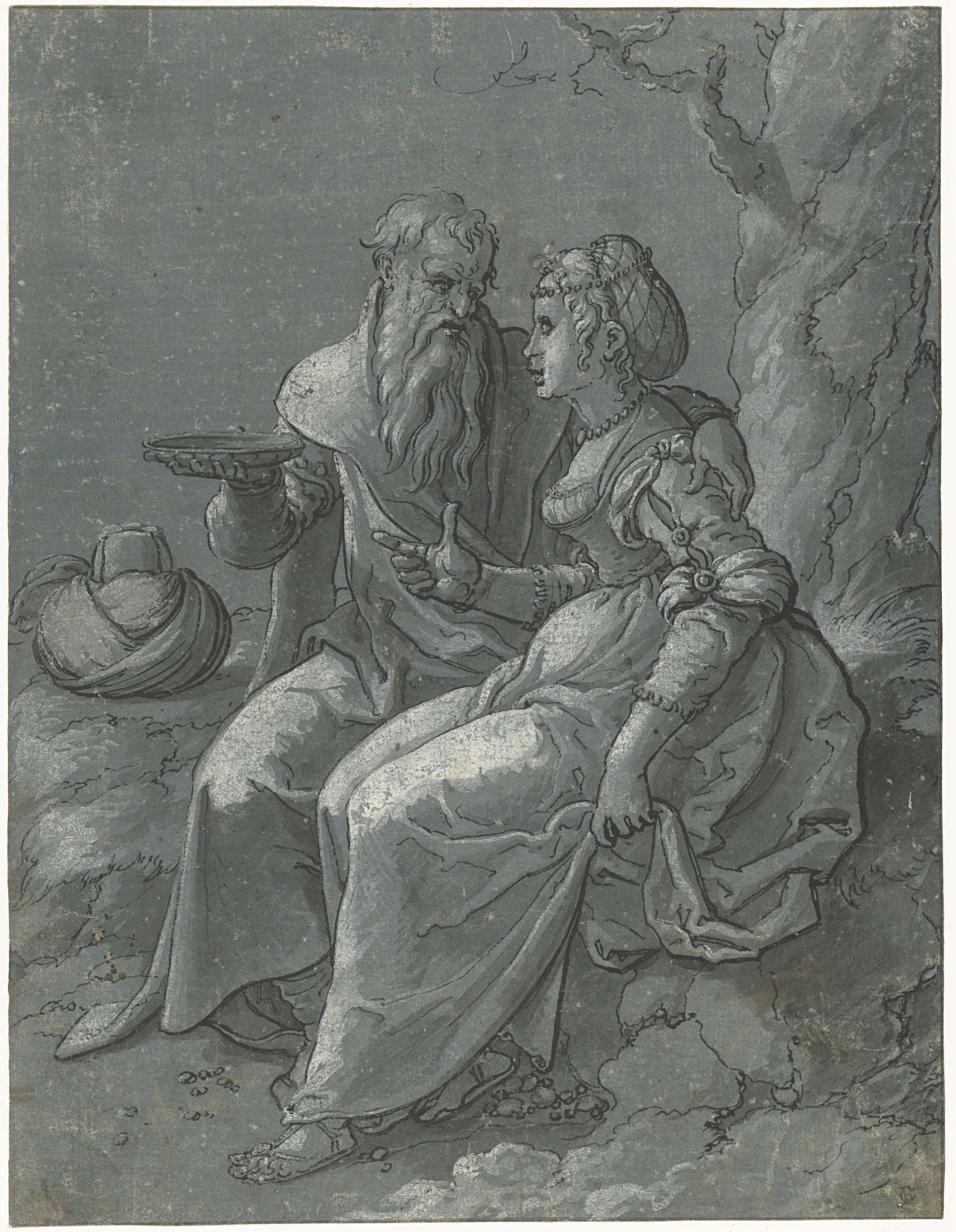 Lot zit met een van zijn dochters voor een boom. Hij houdt een drinkschaal in de rechterhand en legt zijn linkerarm om de schouder van zijn dochter.