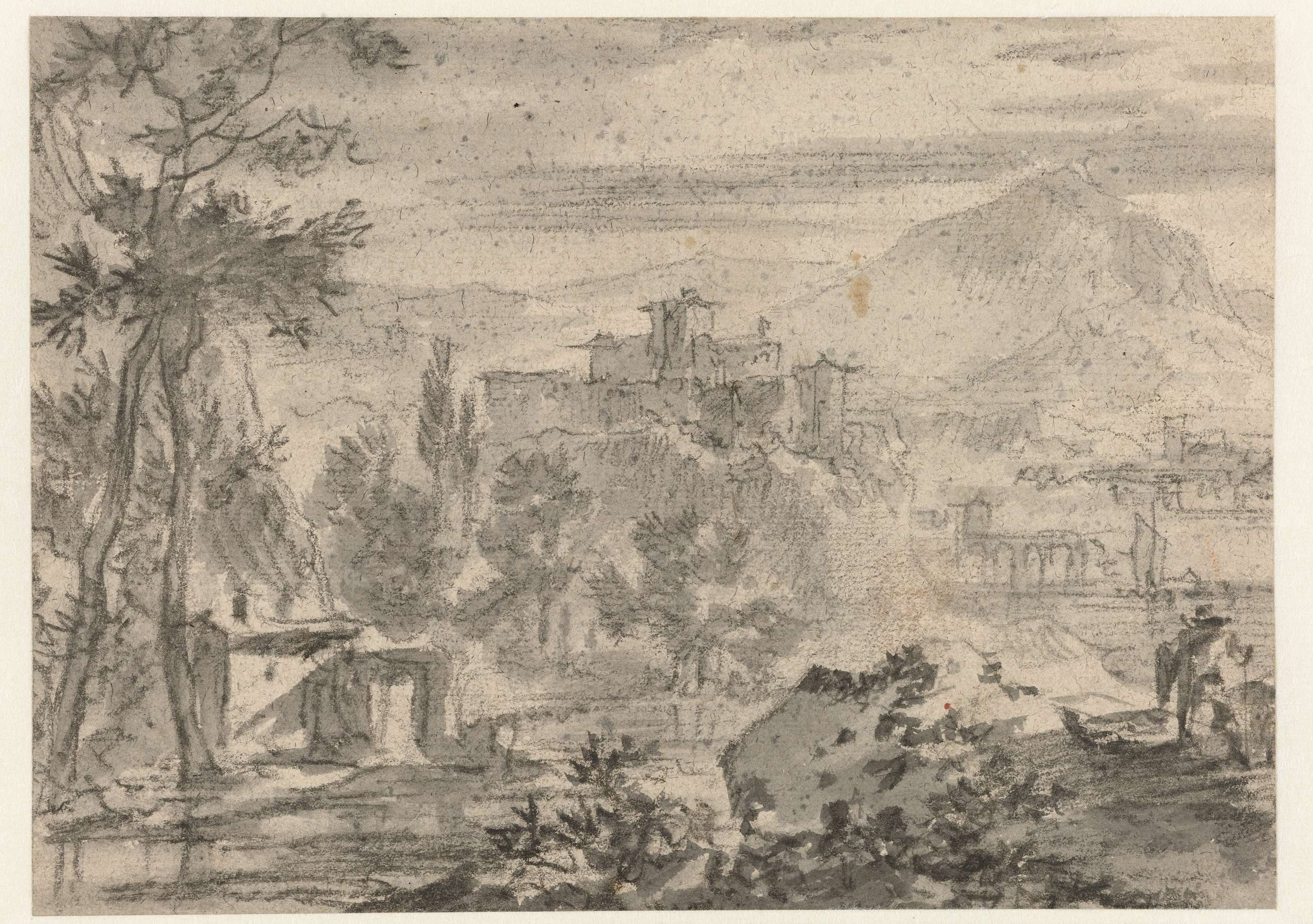 In het midden staat een groot kasteel op een steile berg. Aan de voet van de berg stroomt een rivier en rechts staat een man met een brede hoed.
