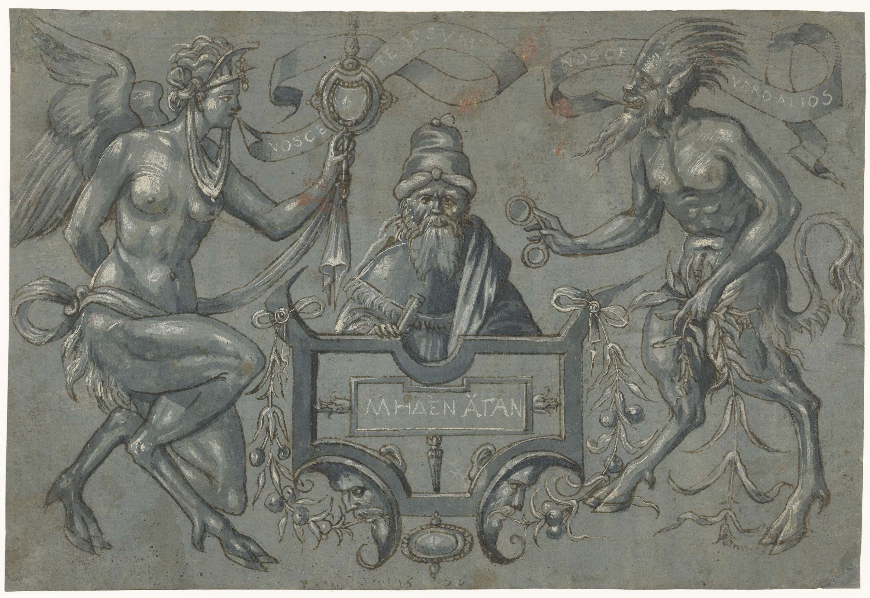 Links een vrouwenfiguur met bokkenpoten, in het midden een man met een hoofddeksel en rechts een sater.