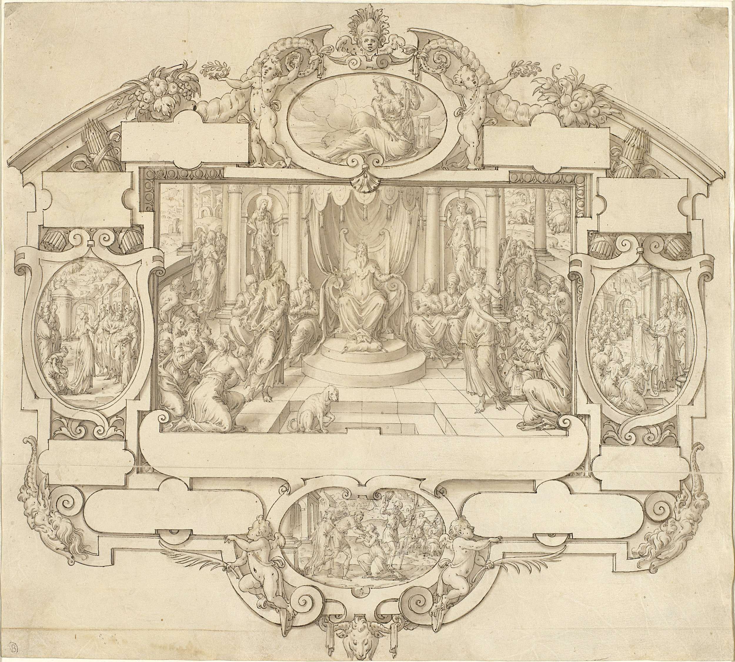 Ornamentale tekening met vijf voorstellingen in cartouches. Centraal een vorst op zijn troon voor twee partijen: rechts Justitia met rijke mensen, links Christus (?) met arme mensen. Boven Temperantia; onder een vrouw door herders bij haar ouders teruggebracht. Links een predikende vrouw en rechts een predikende man. Op de achtergrond de vernedering van Nebukadnezar. Deze ...