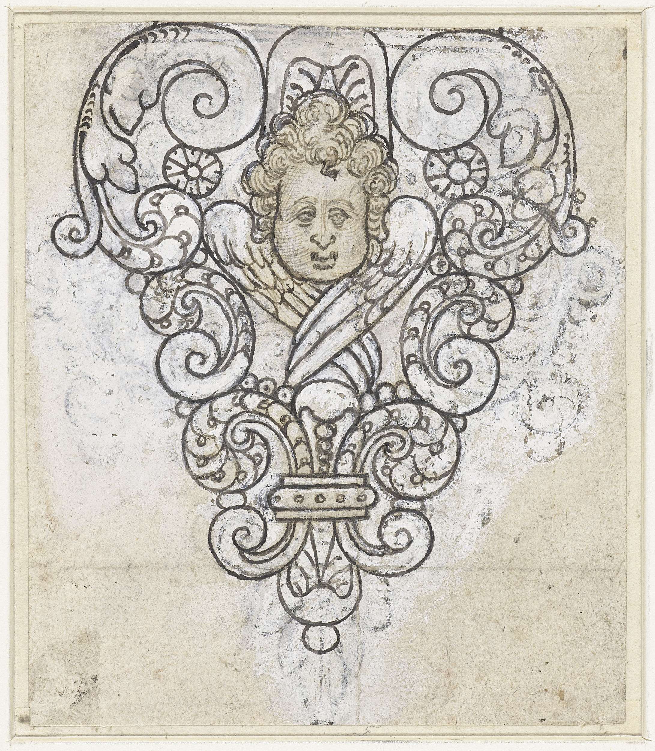 Engelkopje met gekruiste vleugels te midden van voluten