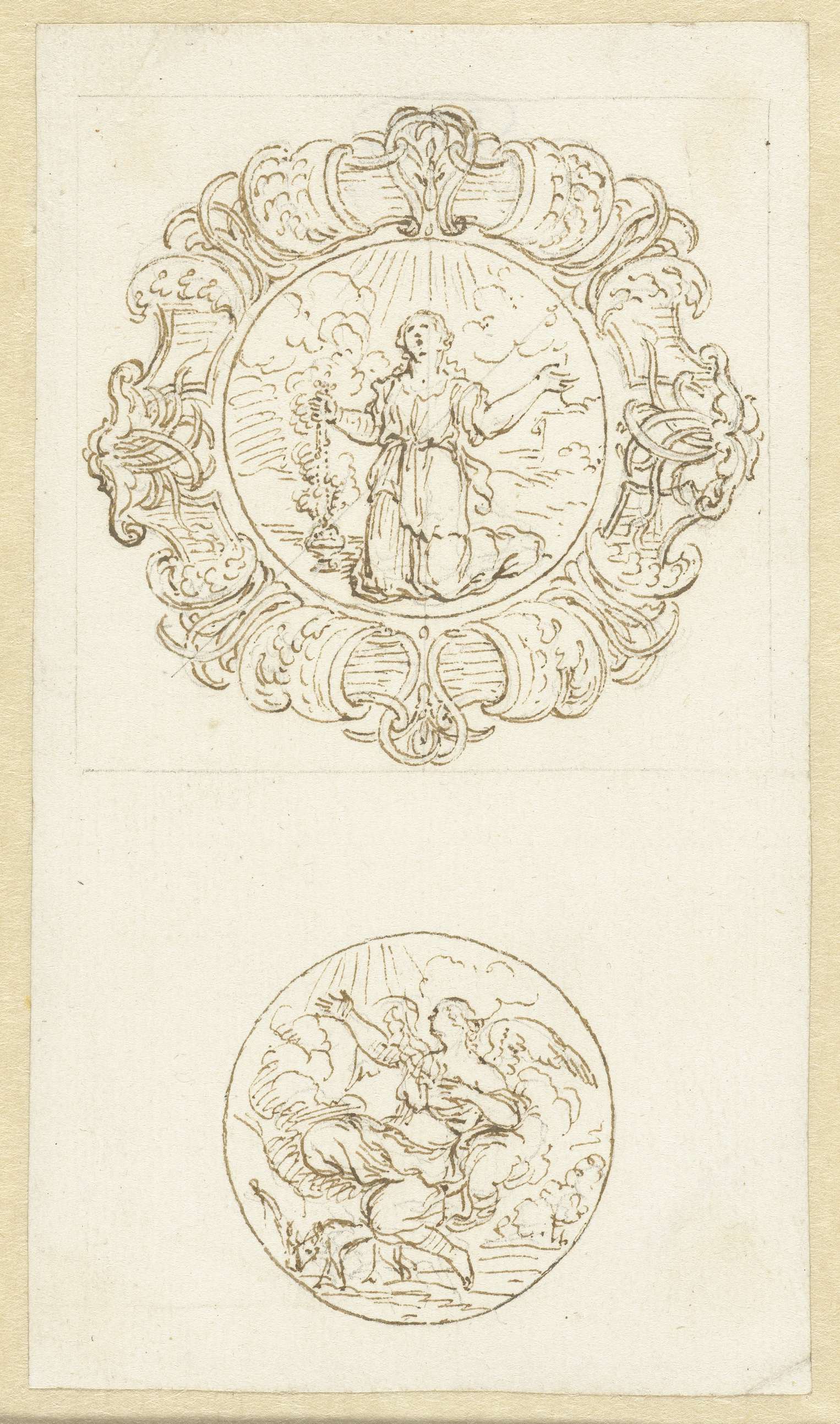Decoratief ontwerp voor een schaal met twee medaillons: boven een knielende vrouwenfiguur, onder een engel boven een landschap.