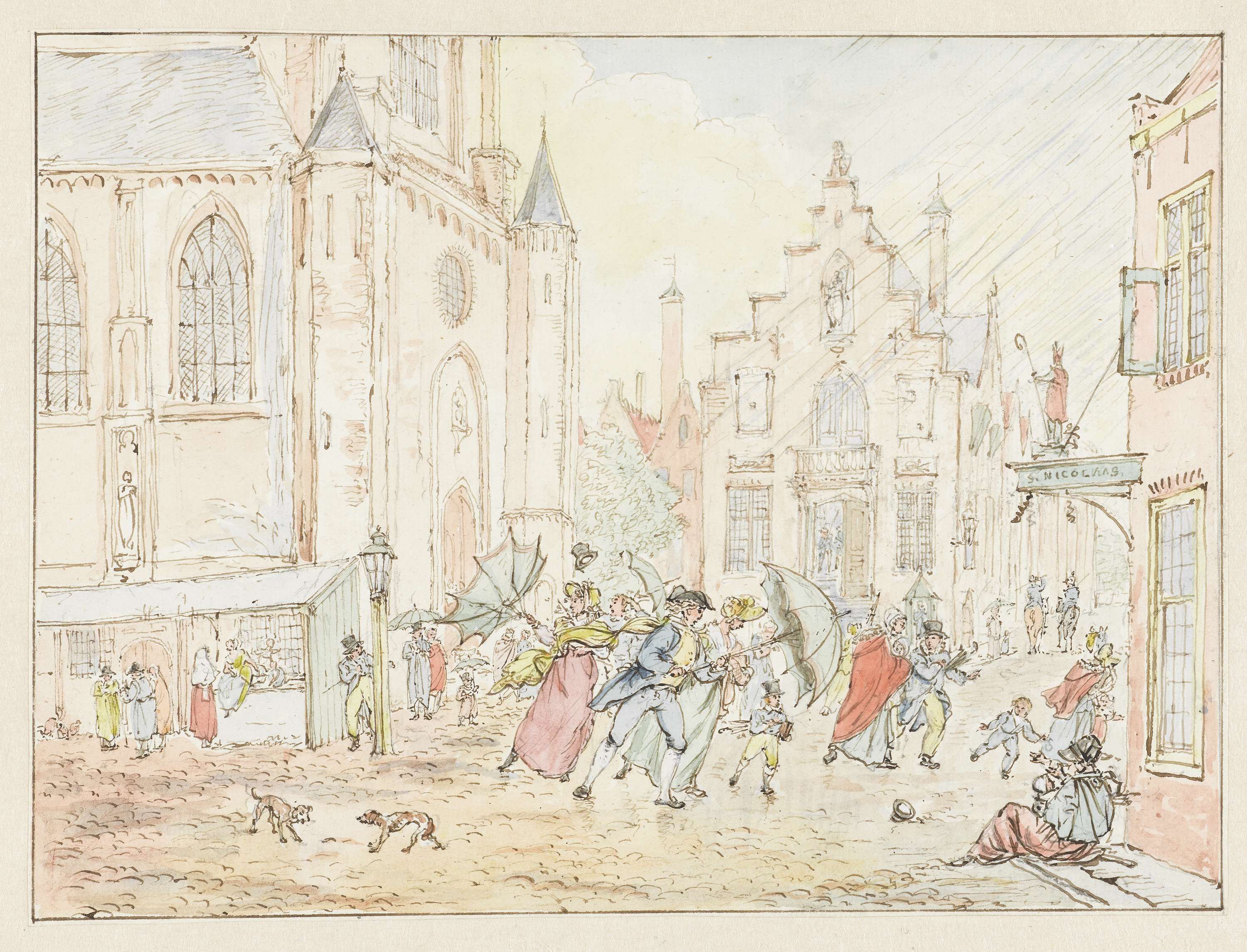 Plein met mensen in de regen