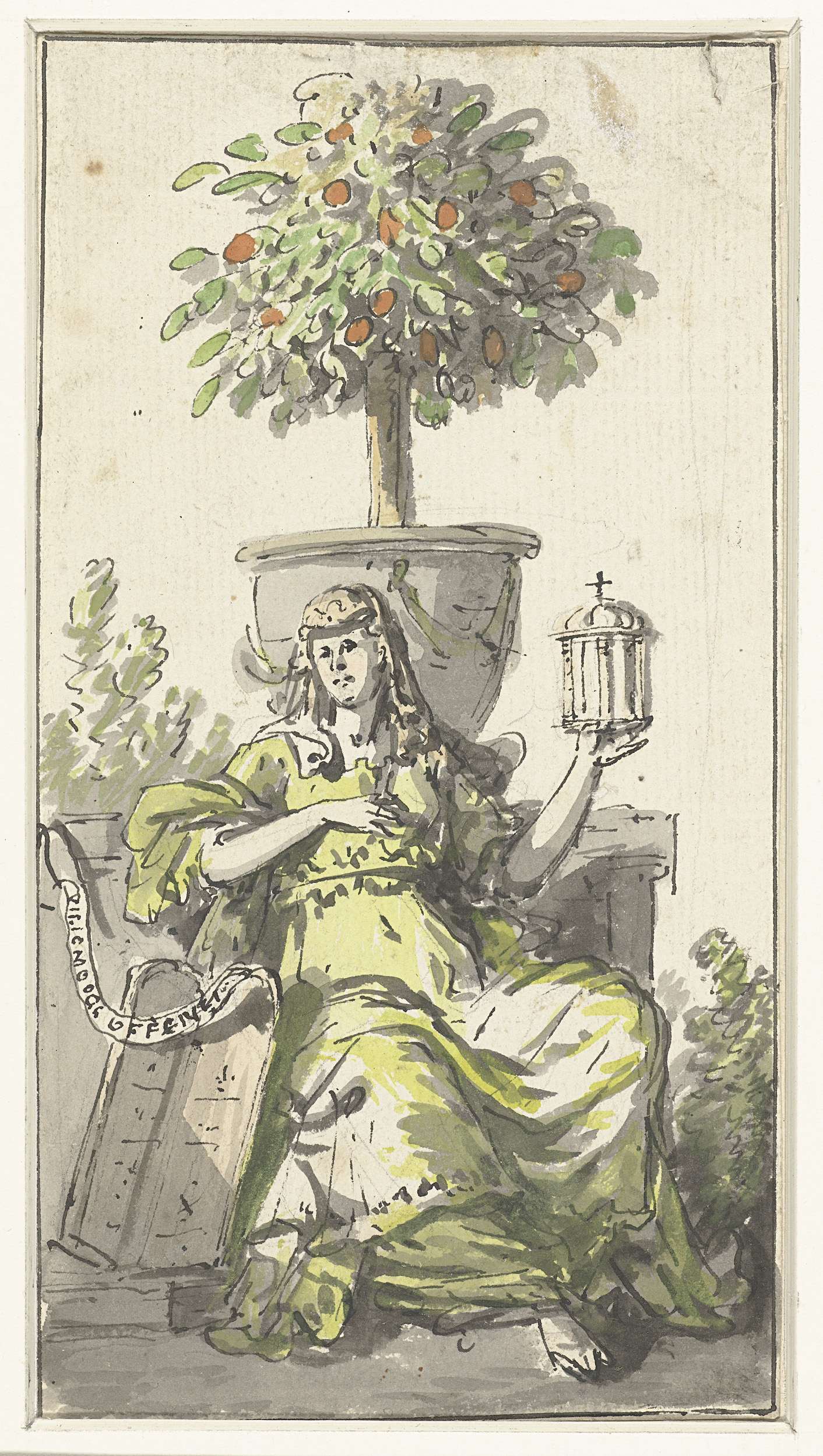 Vrouw met monstrans, gezeten bij de tafelen der wet voor een oranjeboom. Banderol met opschrift: vici-mooge-offenzi (?).