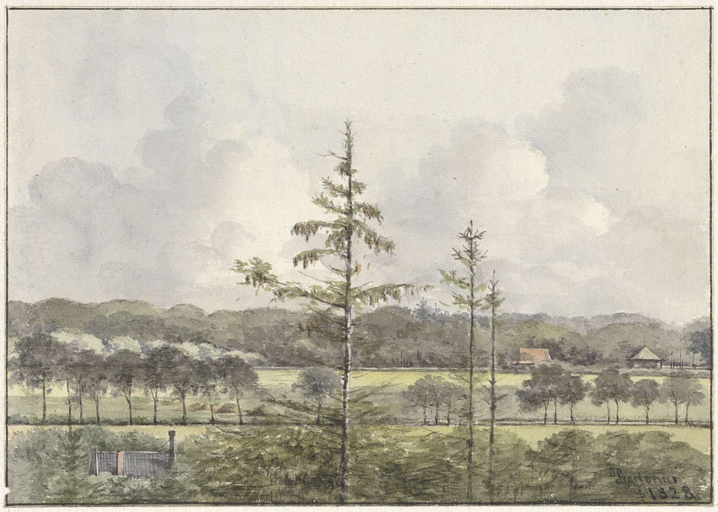 Vergezicht van weilanden met boerderijen, op de voorgrond enkele dennen.
