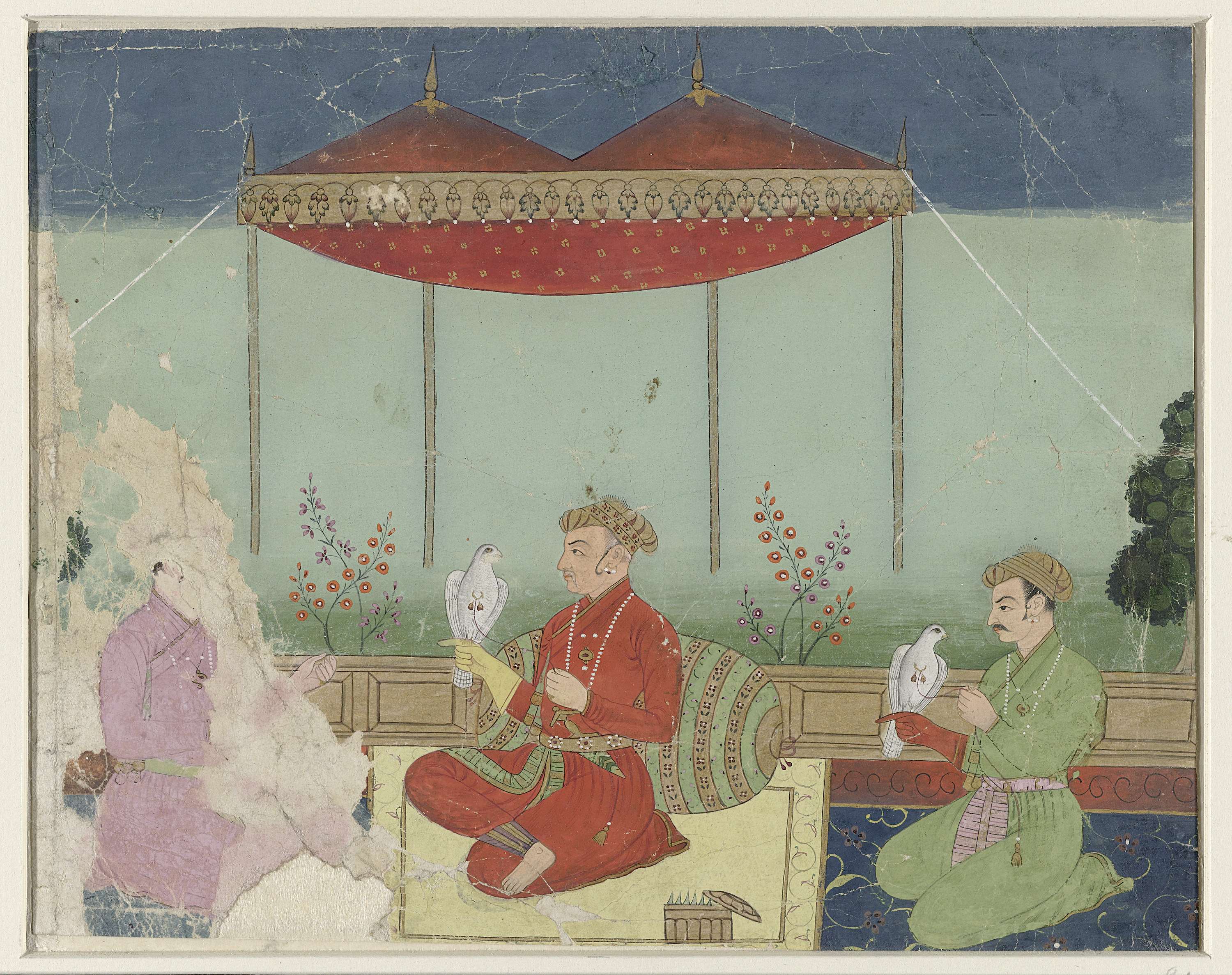 De Mughal keizer Jahangir zittend onder een baldakijn op een terras, in gezelschap van prins Khurram en een valkenier.