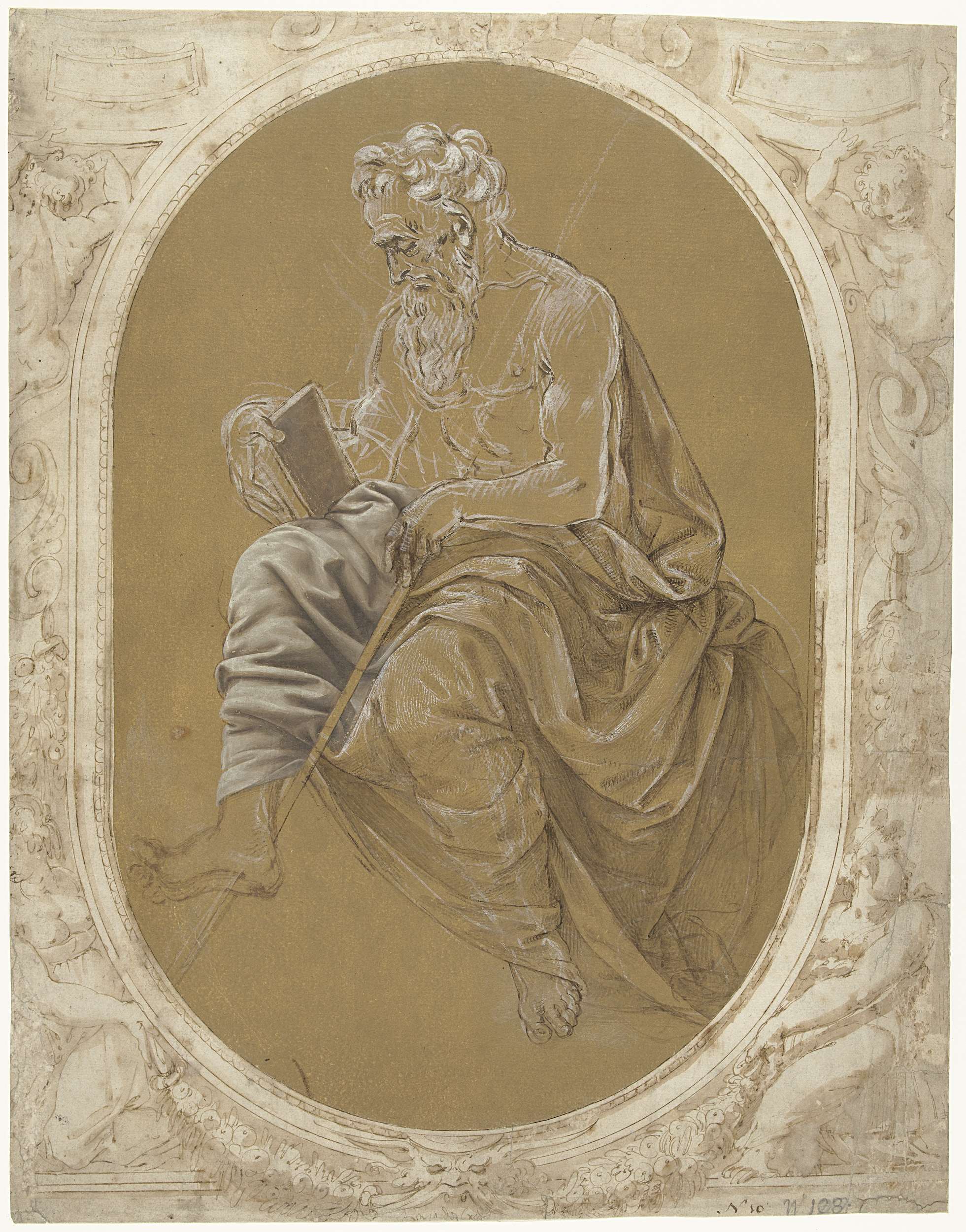 De halfnaakte mannenfiguur steunt op het boek met de rechterhand tegen zijn been; in de linker heeft hij een lange staf die tegen zijn schouder leunt en waaromheen hij de rechtervoet heeft geslagen. De tekening is een voorstudie voor een schilderij voor de pilaster rechts van het altaar in de kerk van Or San Michele ...