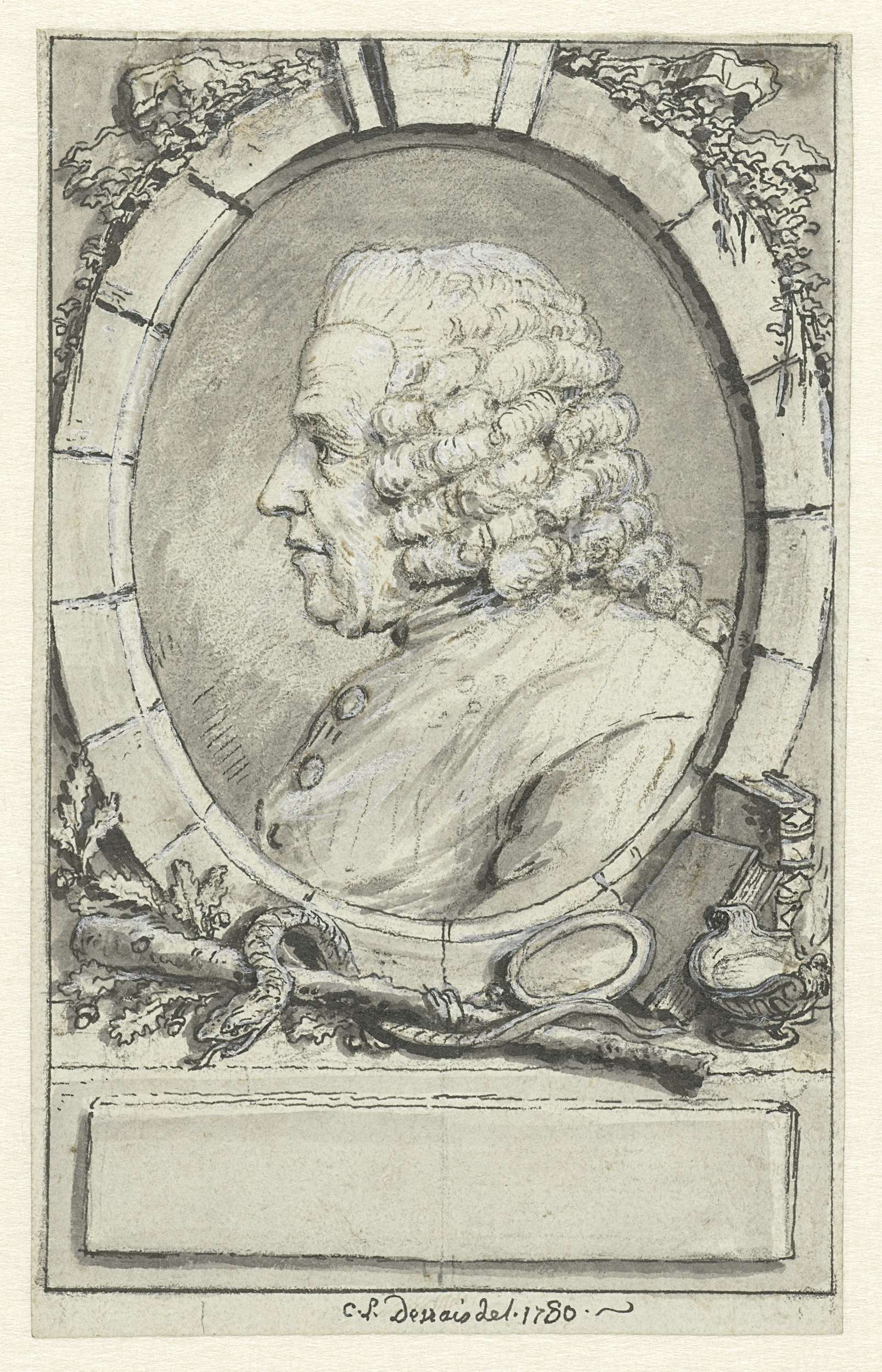 Medaillonportret van een man, in randwerk, met naamplaat. Waarschijnlijk een geleerde, maar het preciese beroep is niet bekend. Mogelijk ontwerp voor een prent.