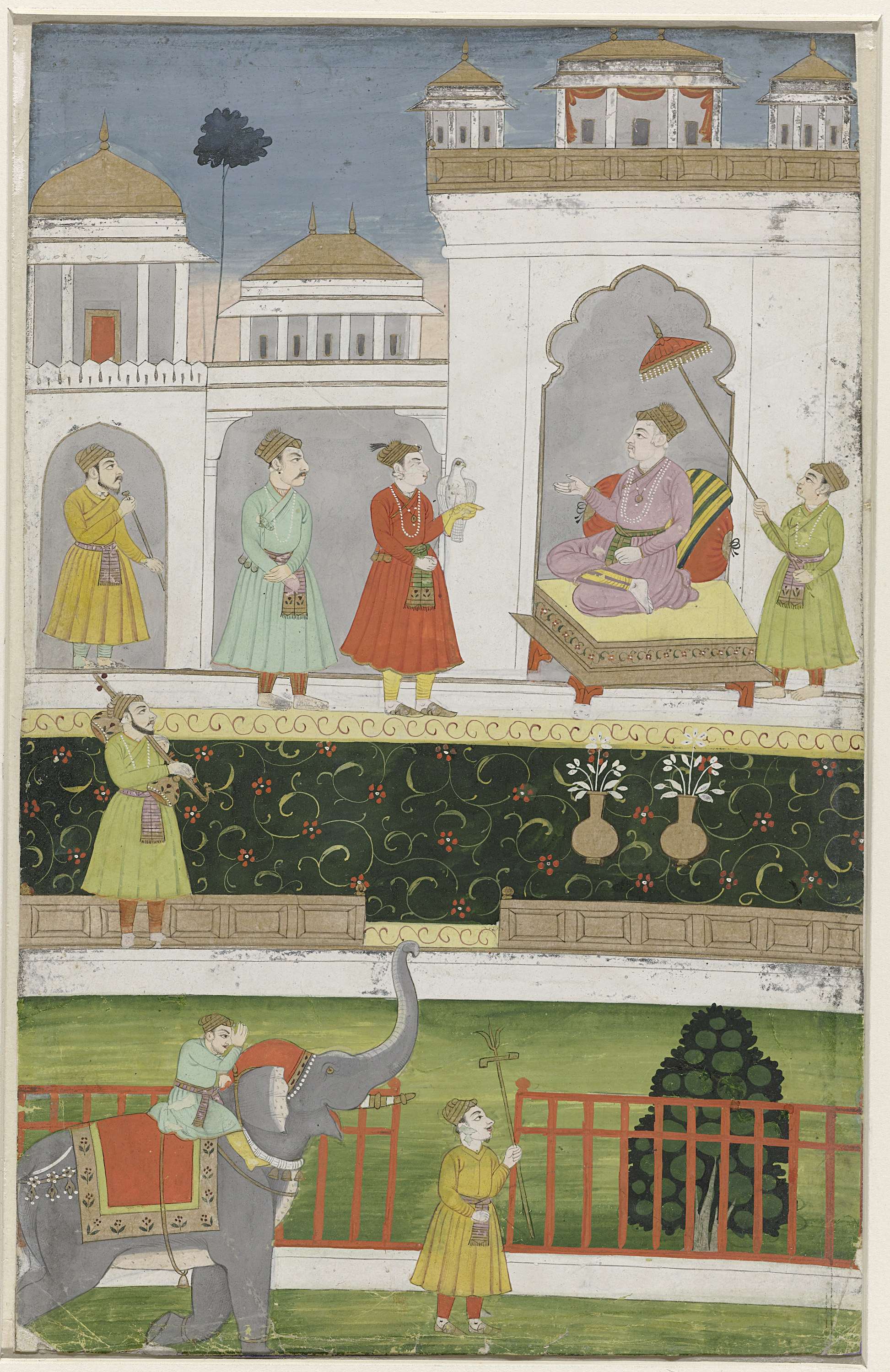 De Mughal keizer Akbar, zittend op zijn troon voor zijn paleis in de paleistuin.