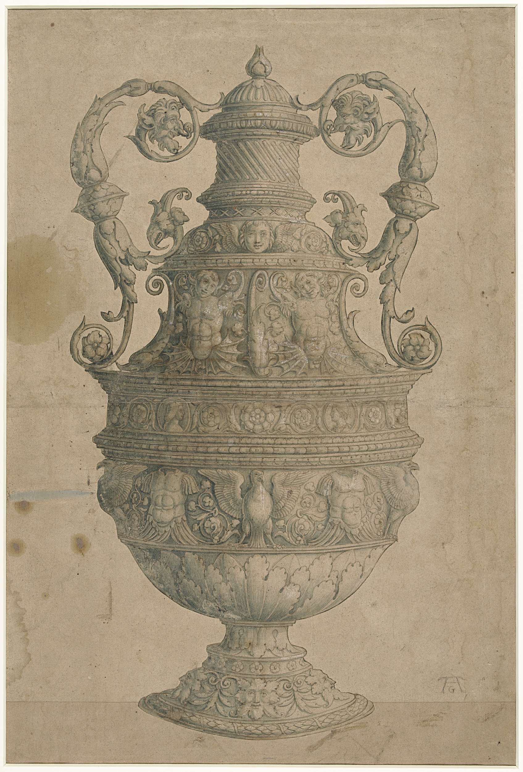 Ontwerp voor een siervaas met twee oren en deksel, versierd met meermannen tussen dolfijnen.