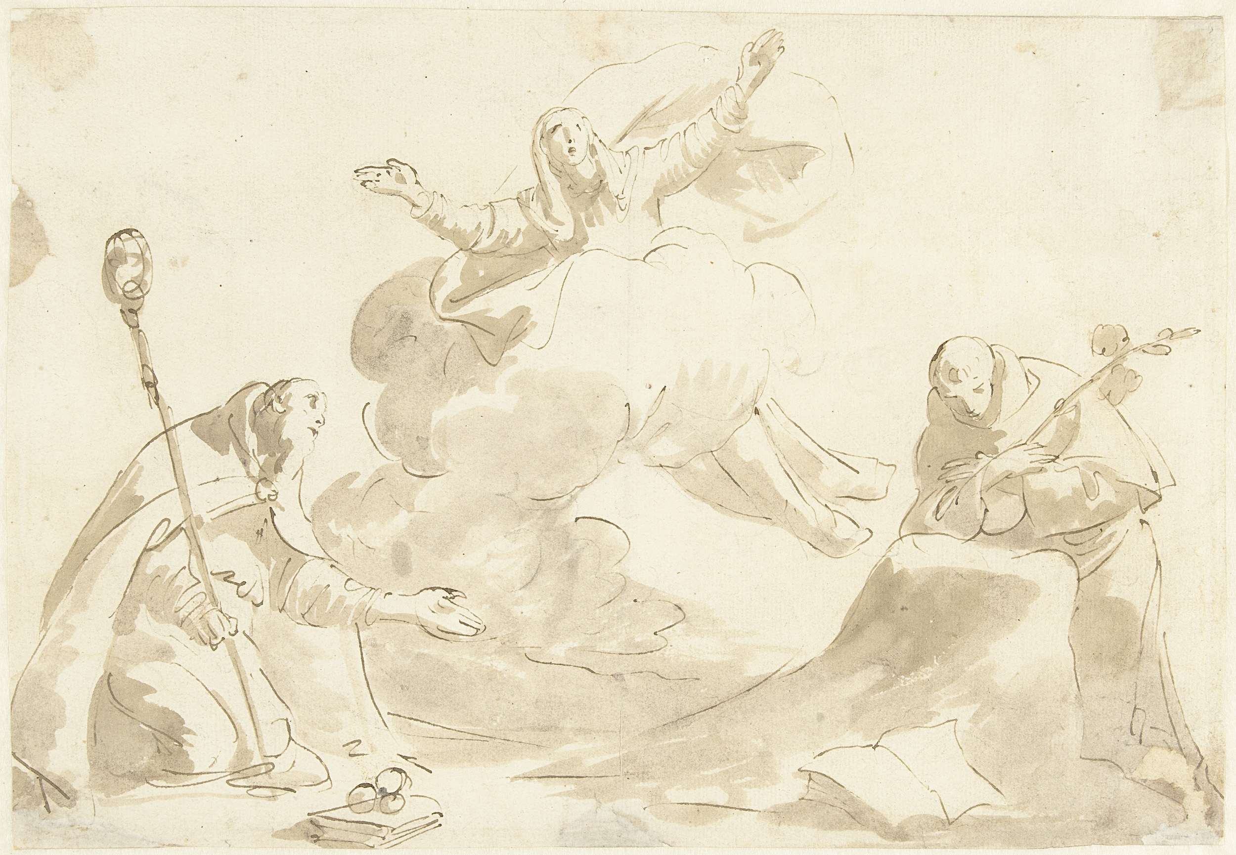 Knielende heiligen Nicolaas en Dominicus bij een ten hemel varende Maria