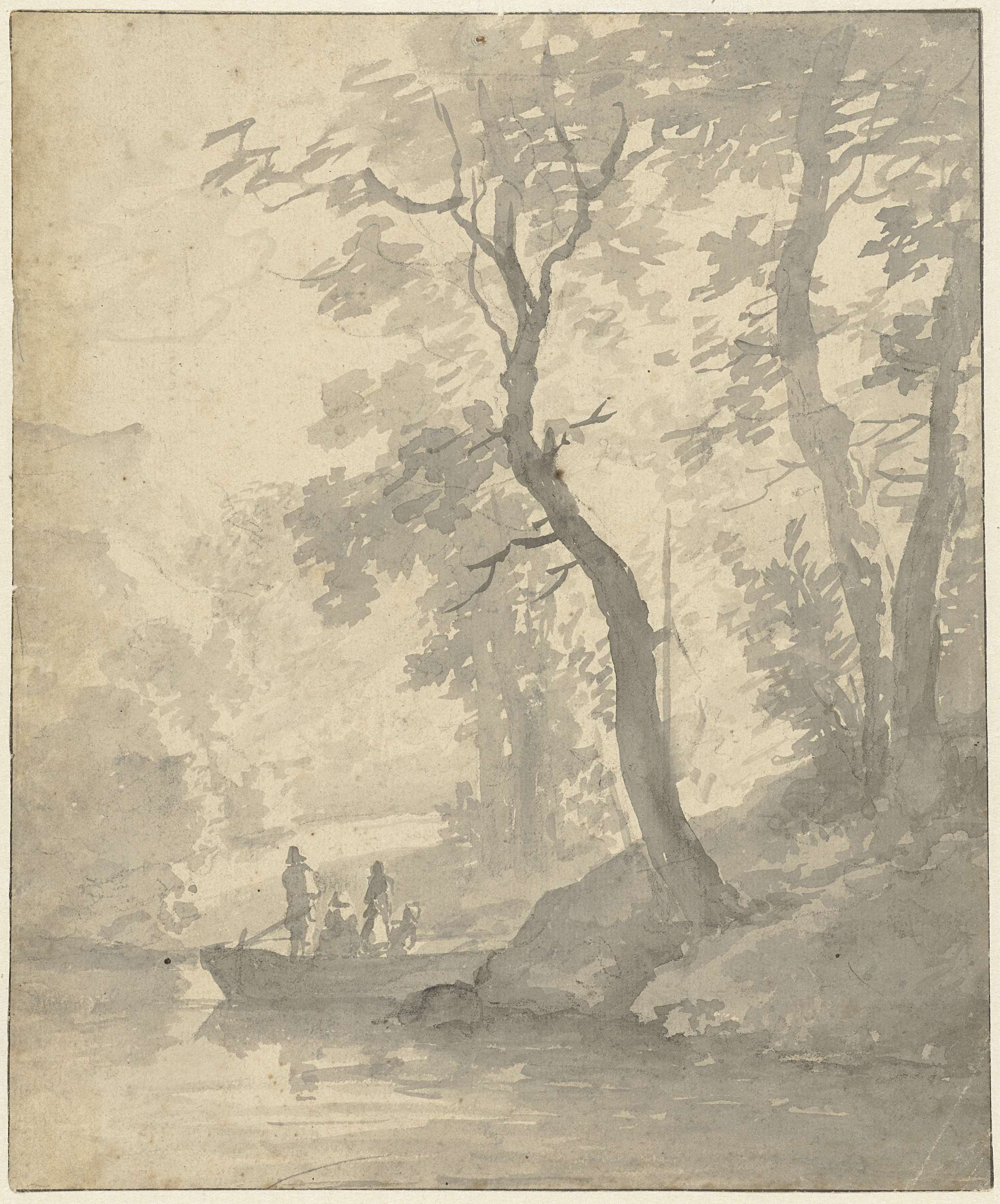 Bomen aan een water waarop een boot met inzittenden