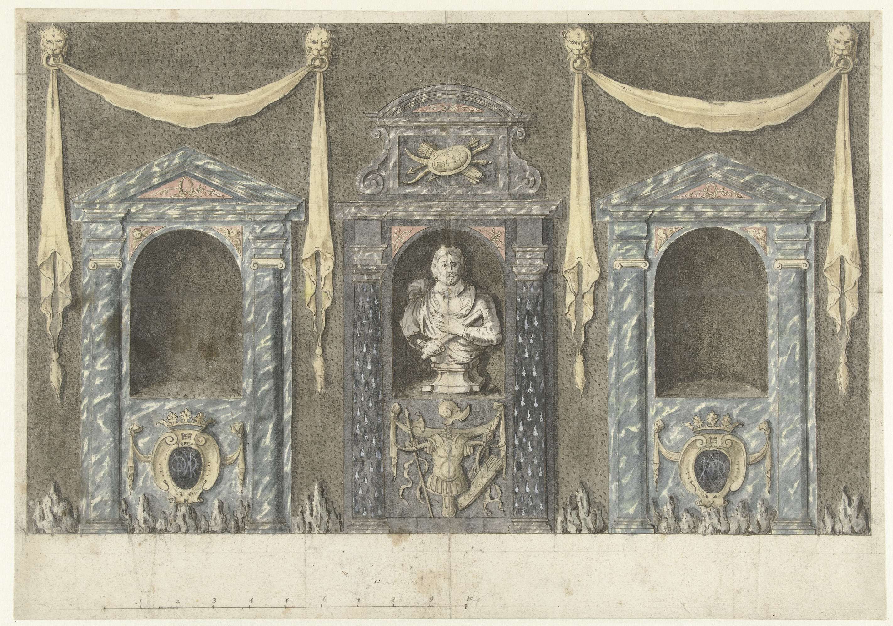 Ontwerp voor een tuingevel met drie portieken en een borstbeeld van Frederik Hendrik.