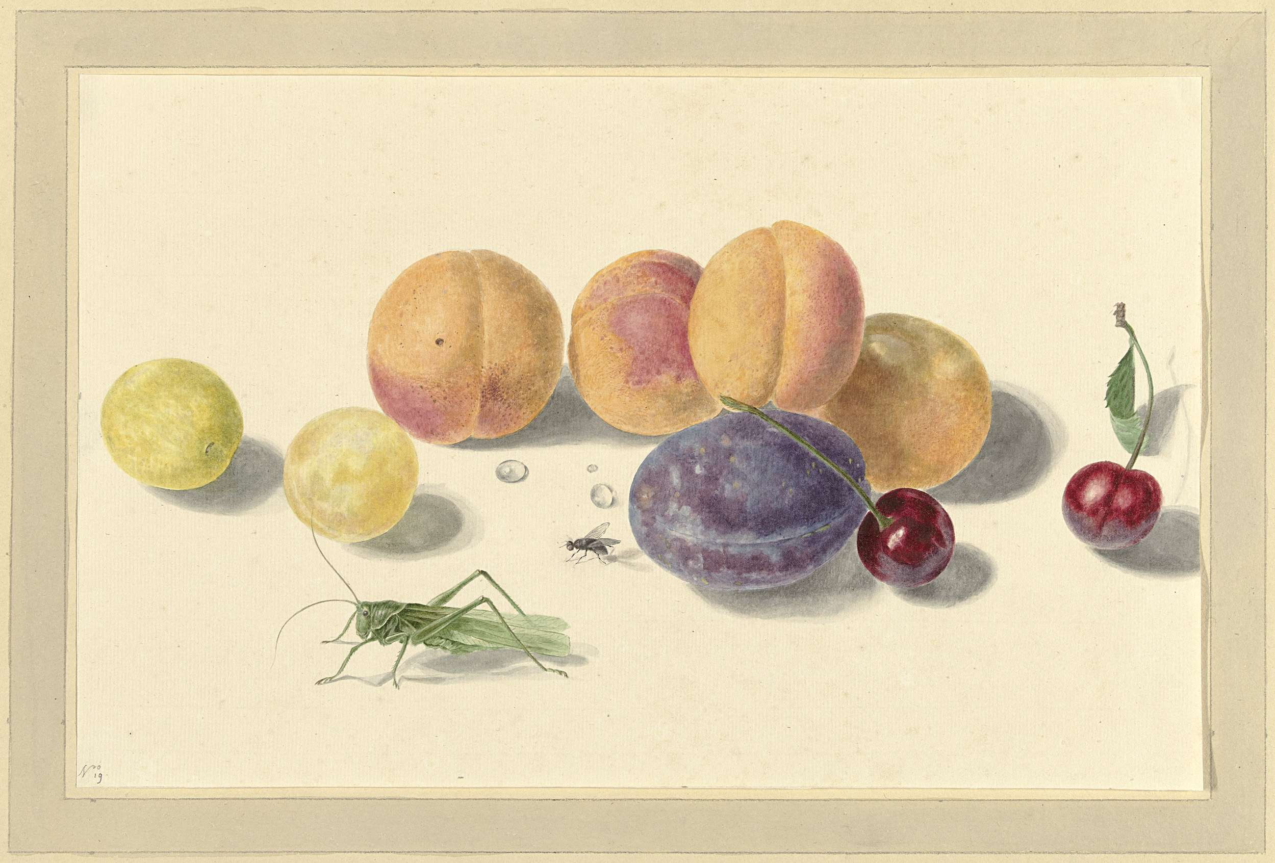 Perziken, pruimen, kersen en twee insecten