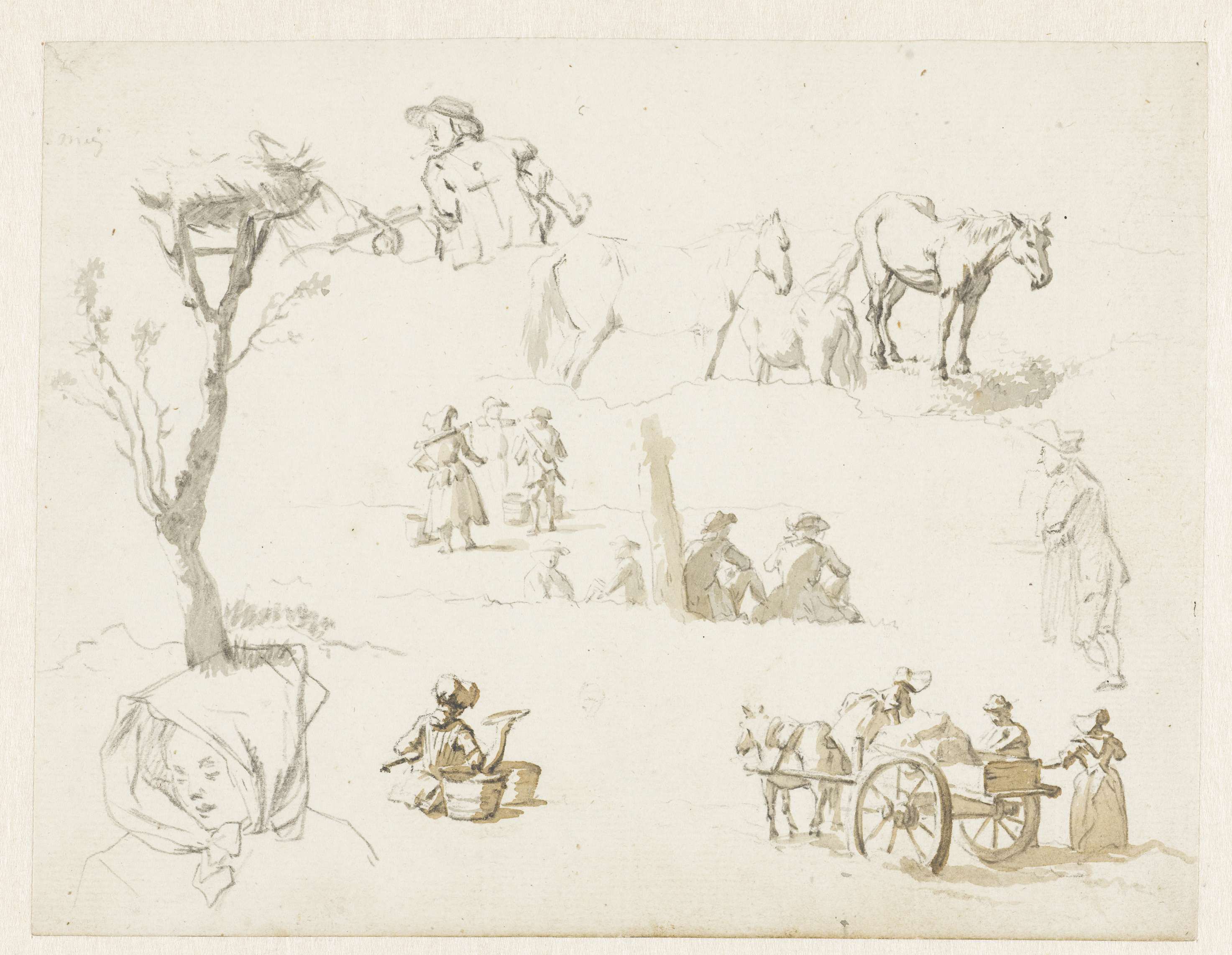 Schetsblad met studies van landlieden, paarden en een ooievaarsnest.