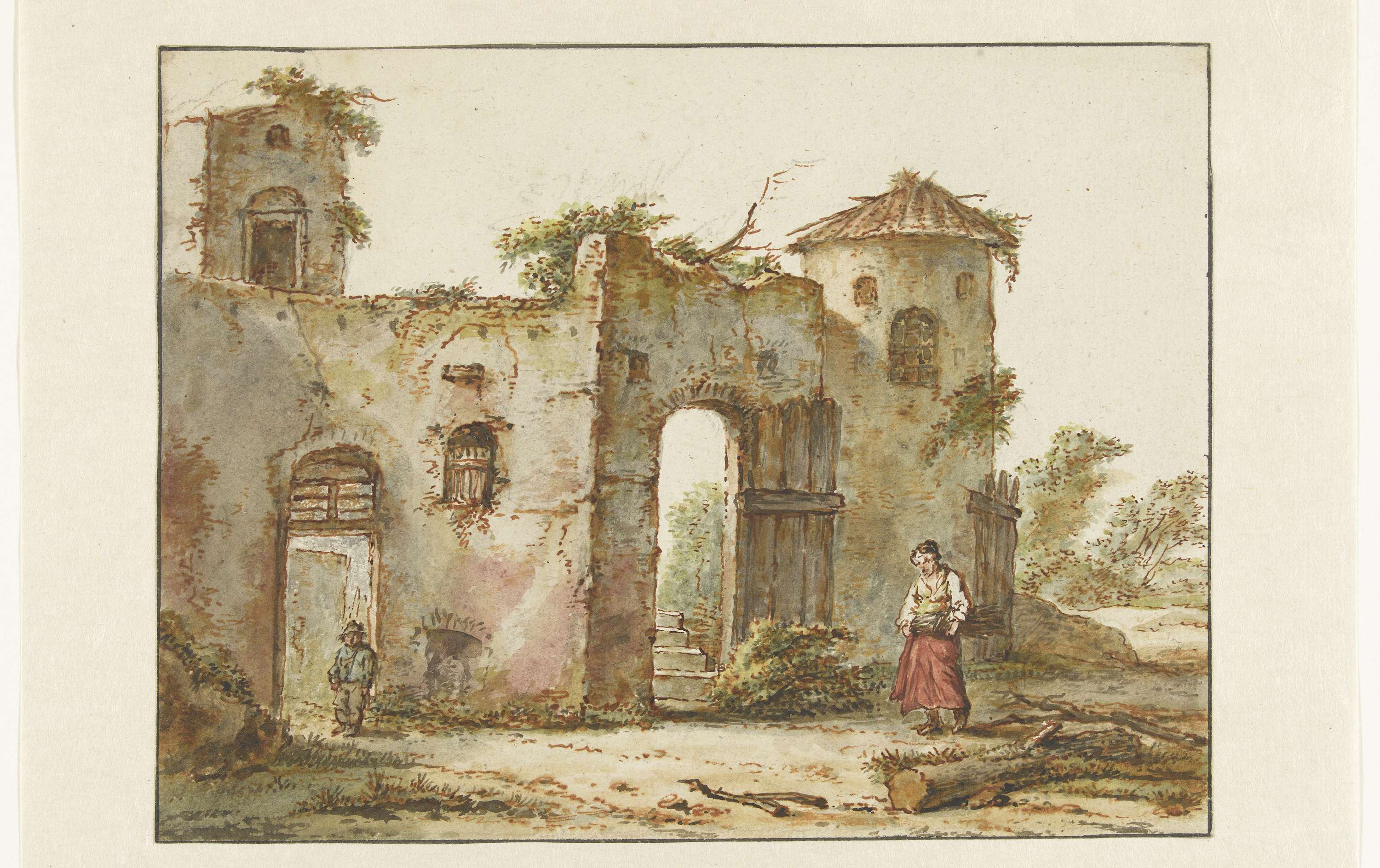 Vervallen gebouw met rechts een houtsprokkelaarster