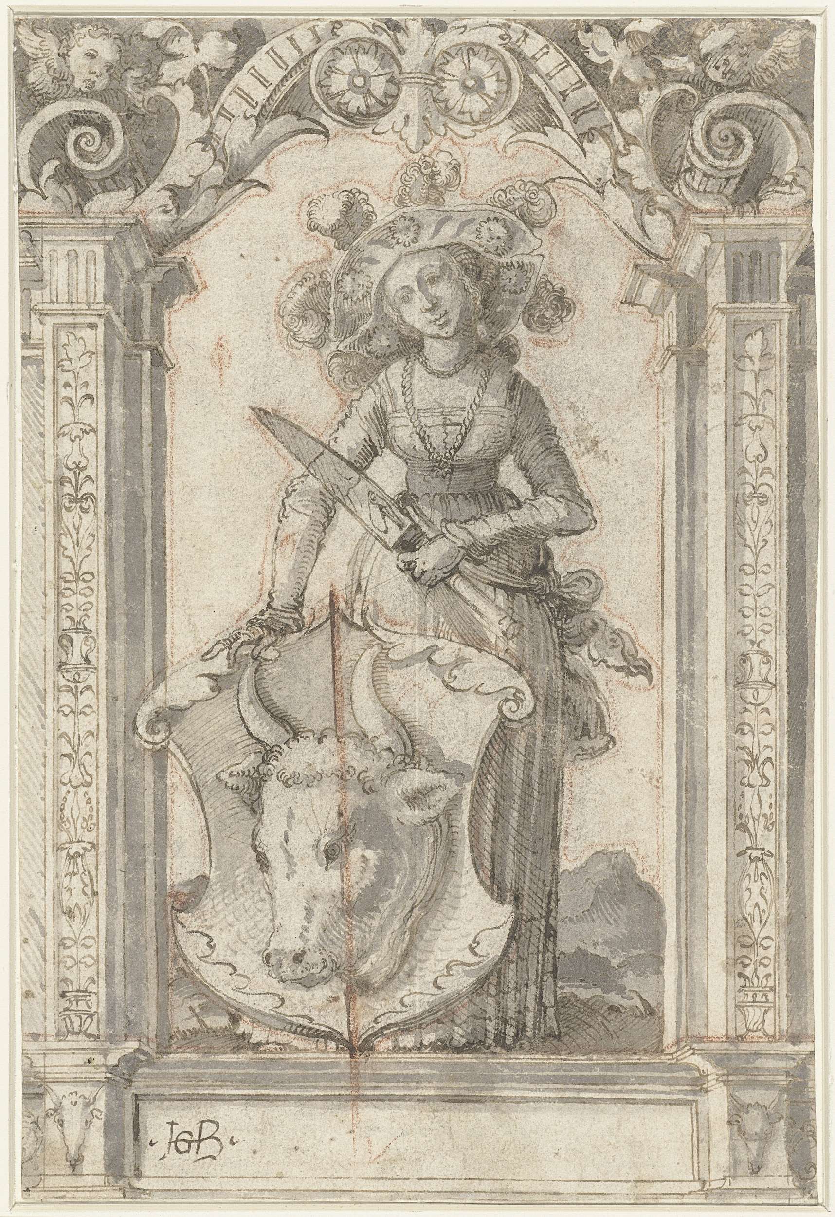 Ontwerp voor een wapenraam van het slagersgilde: een vrouw met een groot slachtmes houdt een wapen met een runderkop vast.