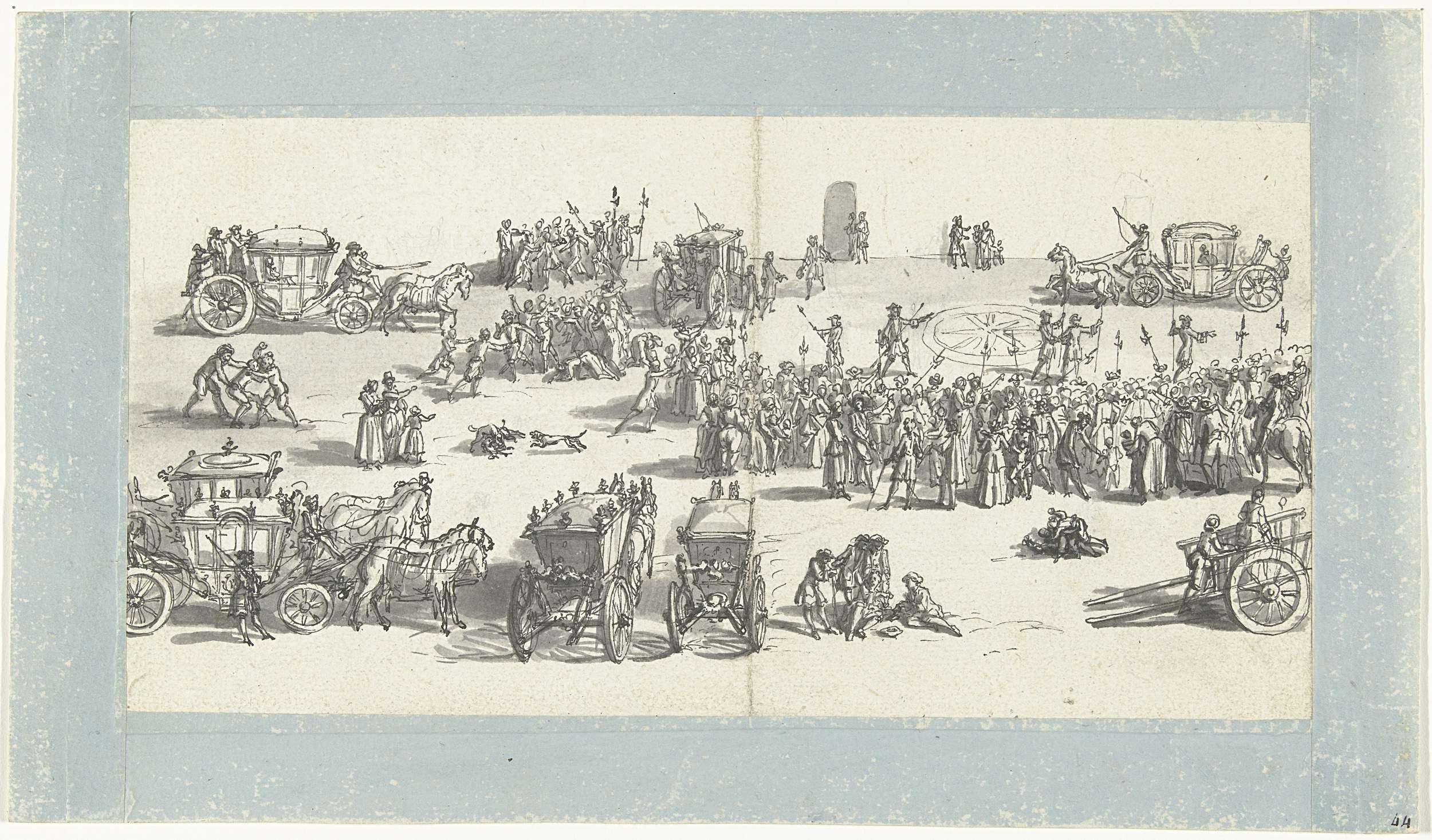 Menigte en karossen op een plein