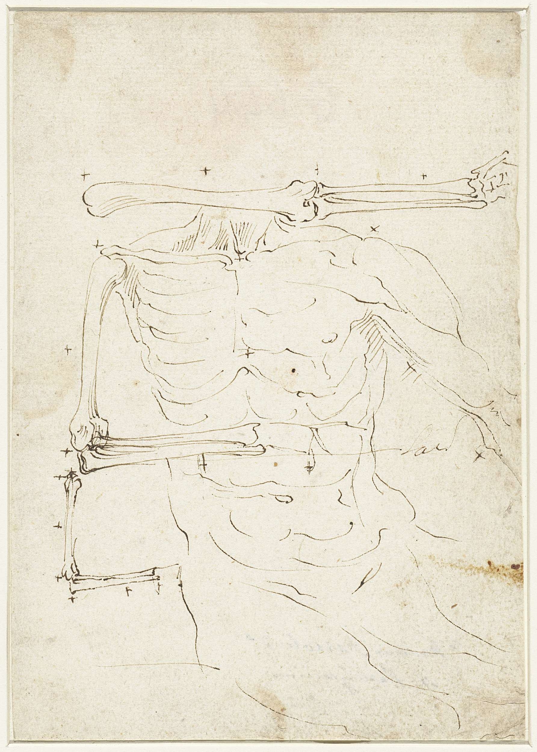 Studie van een romp, gedeeltelijk als skelet, gedeeltelijk met spieren bekleed.