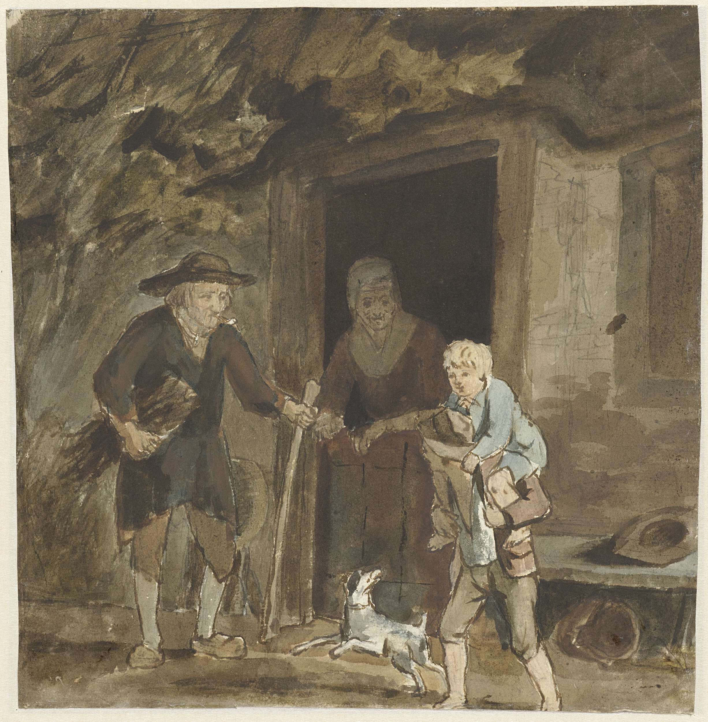Boerengezin bij de deur van hun woning