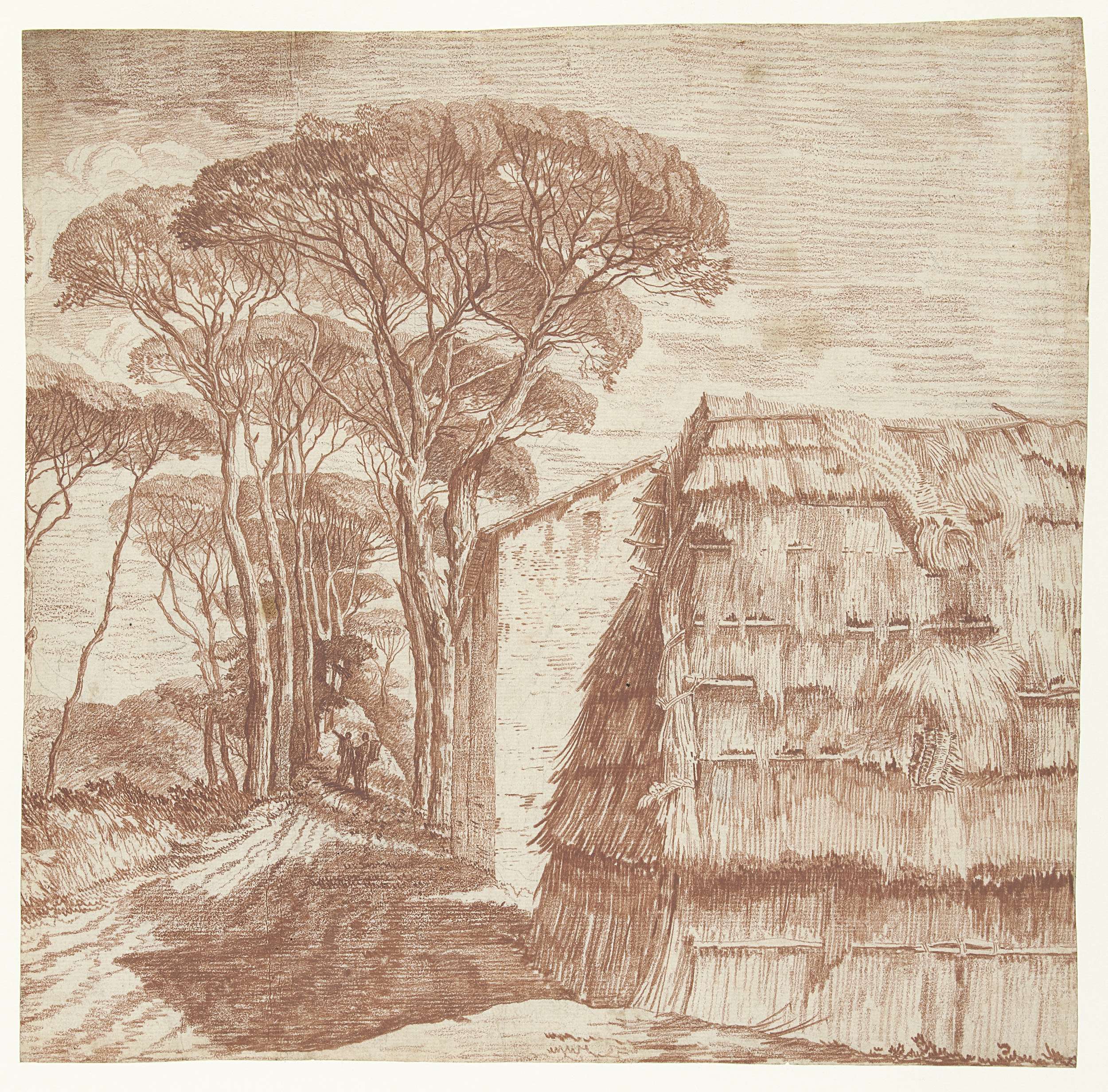Pijnboomlaantje met huizen en een plaggenhut op de voorgrond