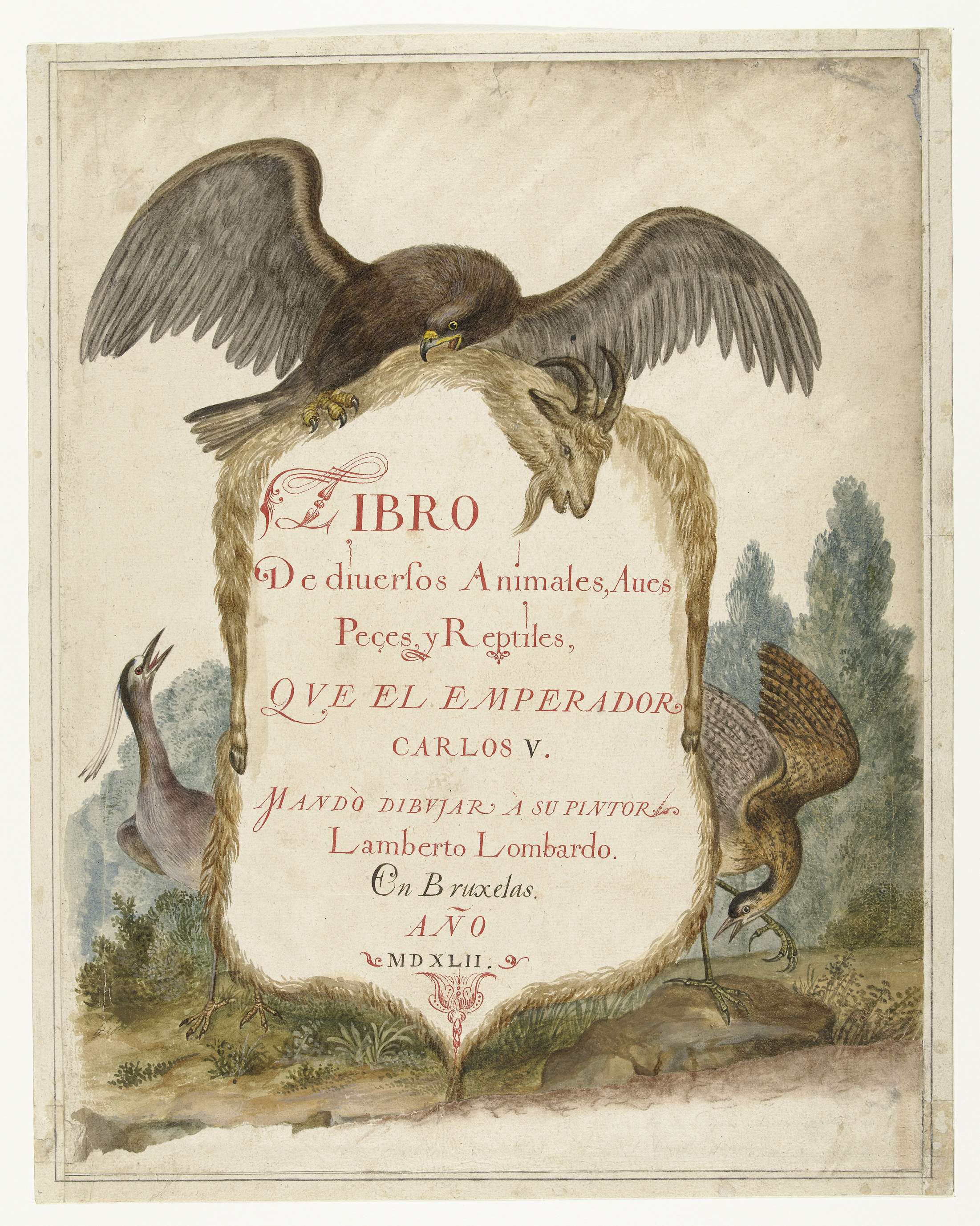 Cartouche van geitenvel, opgehouden door een steenarend (Aquila chrysaetos), kwak (Nyciticorax nyciticorax) en roerdomp (Botauris stellaris).