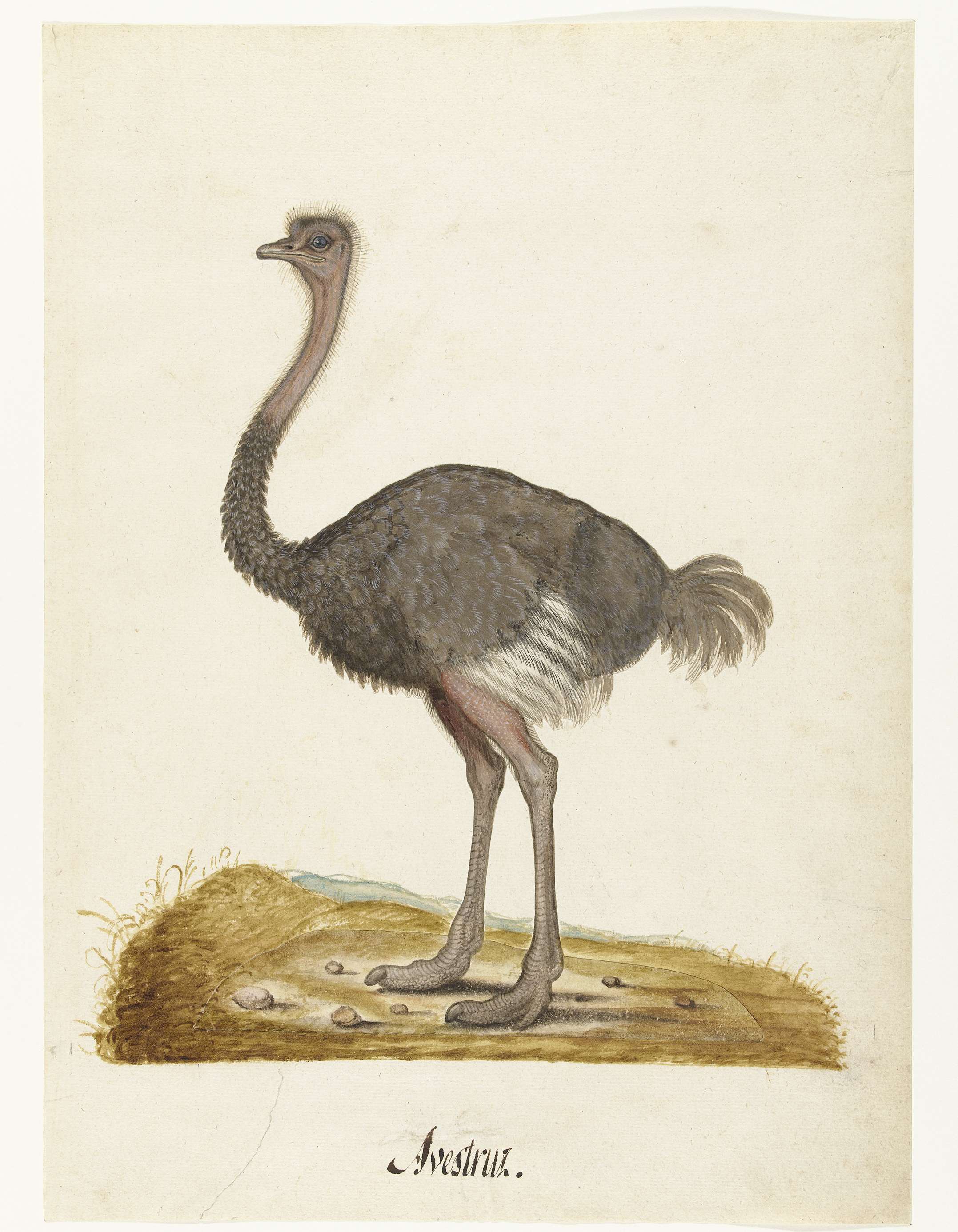 In de 16de eeuw maakten kunstenaars – die nog nooit een levende struisvogel hadden gezien – soms de fout het dier vliegend in de lucht weer te geven. Deze kunstenaar tekende de loopvogel zoals het hoorde, stevig met zijn poten op de grond. Ook de details, zoals de fijn geschilderde donsveren en het kale kippenvelletje ...