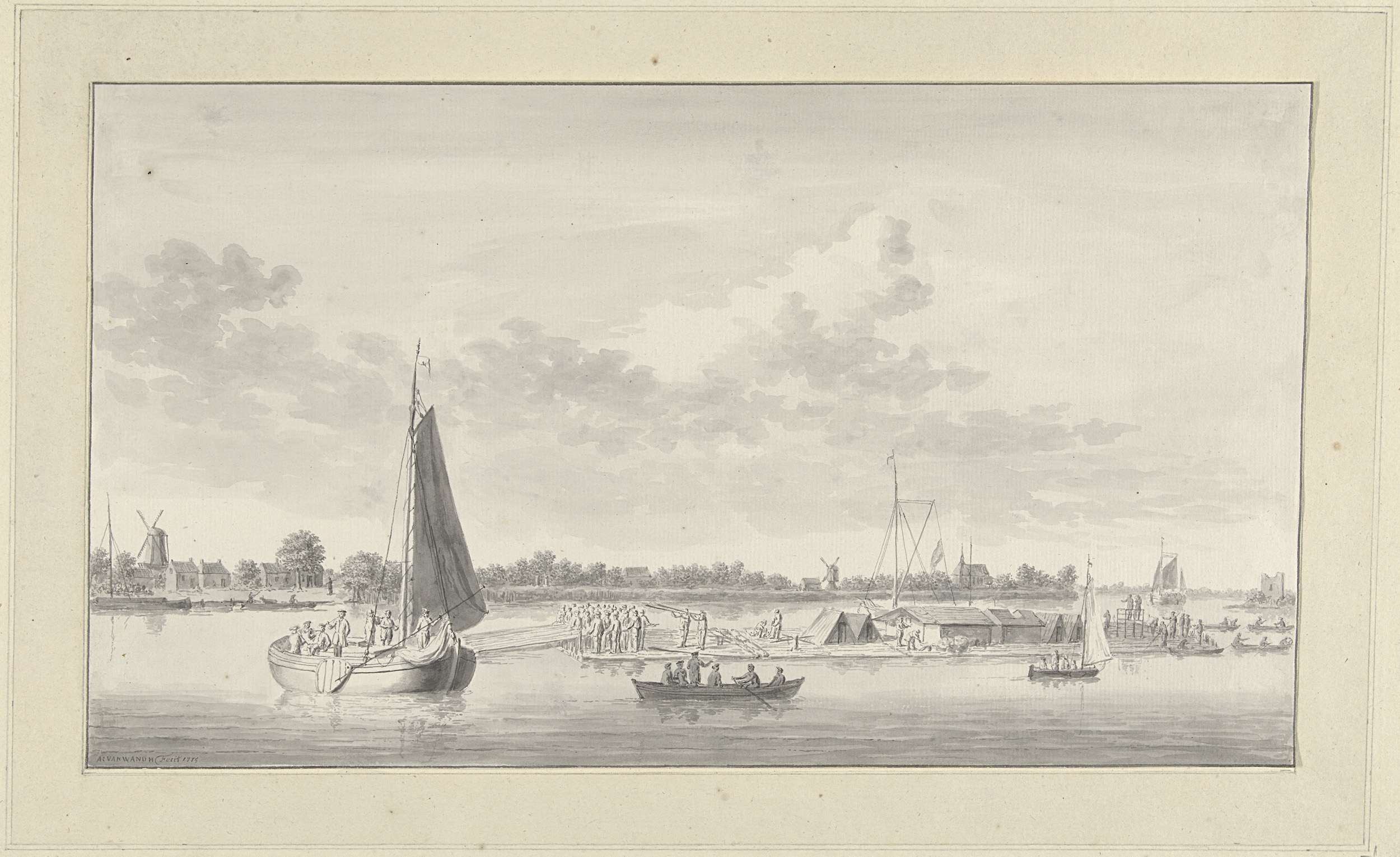 Groot vlot en verschillende schepen op de Merwede bij het huis de Merwe bij Dordrecht