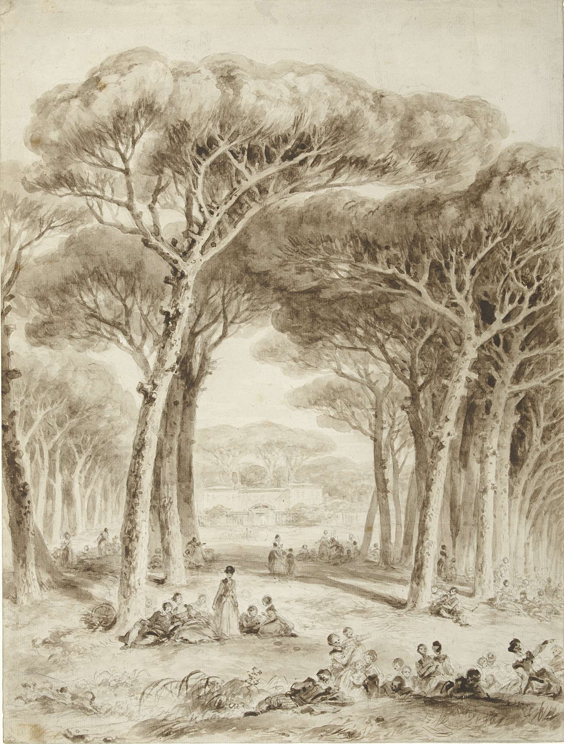 Fragonard werd geboren in Zuid-Frankrijk en volgde zijn opleiding tot kunstenaar in Italië. Hij was gevoelig voor een zuidelijke sfeer. In deze tekening gaf hij bijvoorbeeld het gouden Italiaanse zonlicht weer door stukken van het crèmekleurige papier onbewerkt te laten. Met zachte, verdunde bruinen suggereerde Fragonard de heiige verte, terwijl hij de voorgrond juist met ...