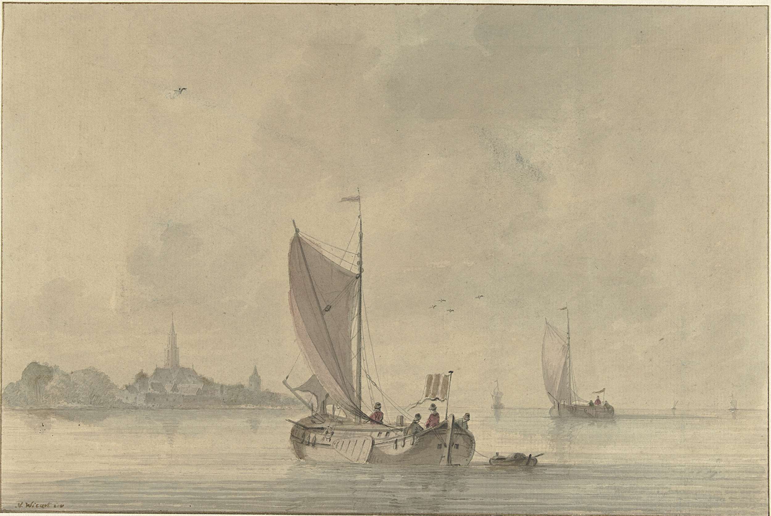 Zeilende schuiten op het water voor een Hollands stadje