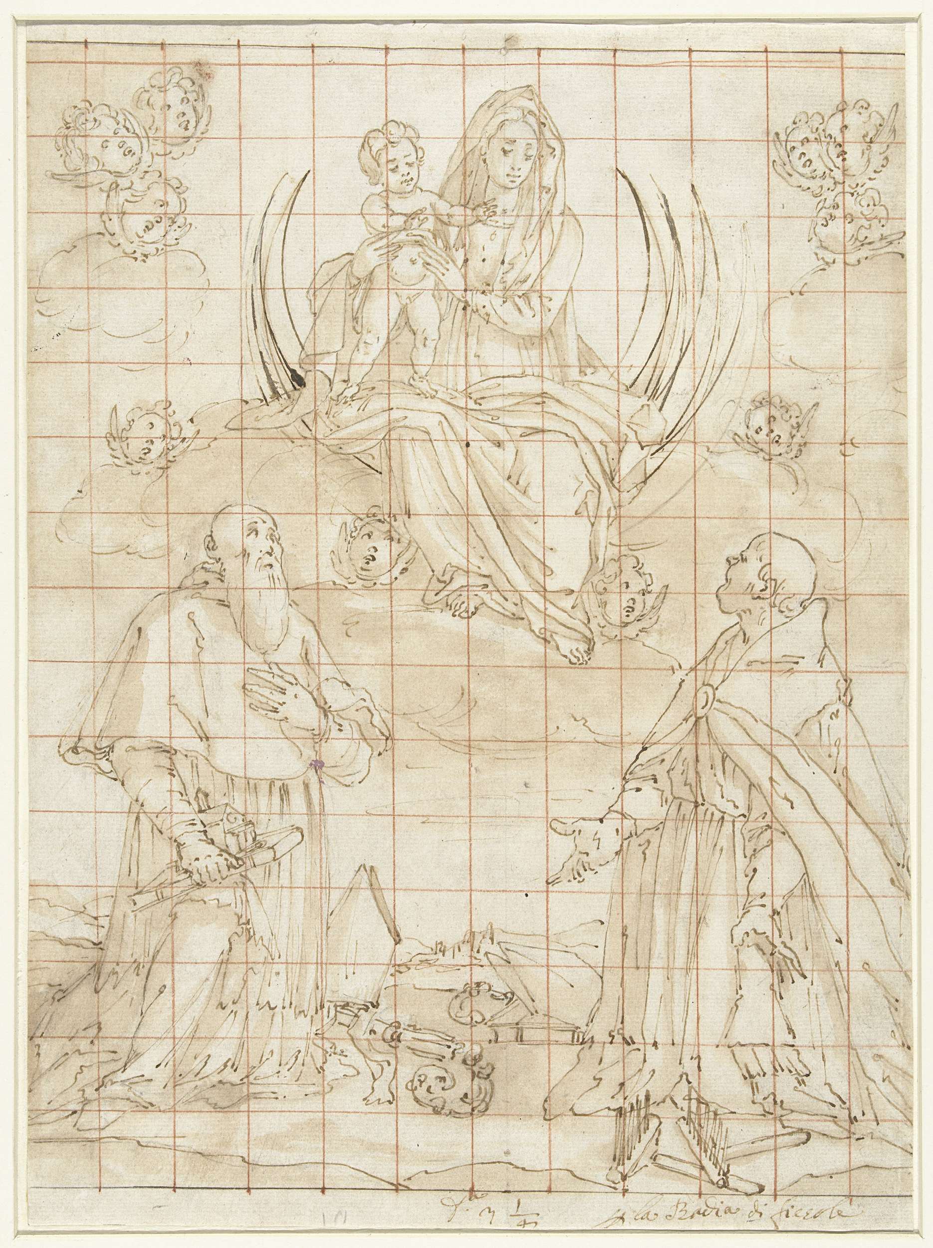 Madonna tronend op een halve maan op wolken, vereerd door twee heiligen (mogelijk de H. Benedictus of de H. Fredianus), die voor haar knielen. Ontwerp voor een schilderij.