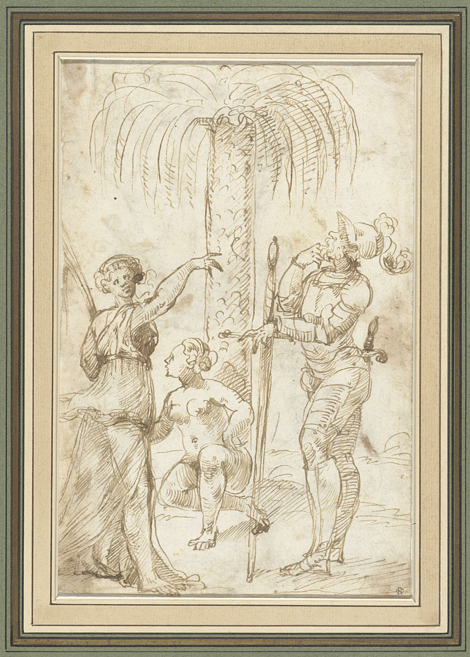 De Faam komt toe op een krijgsman bij een palmboom waaronder een naakte vrouw zit.