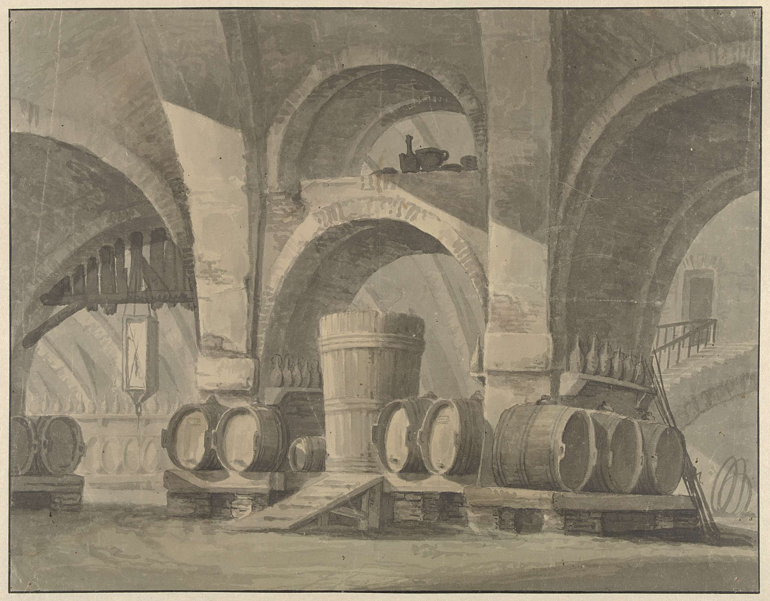 Interieur van een kelder met wijnvaten en flessen