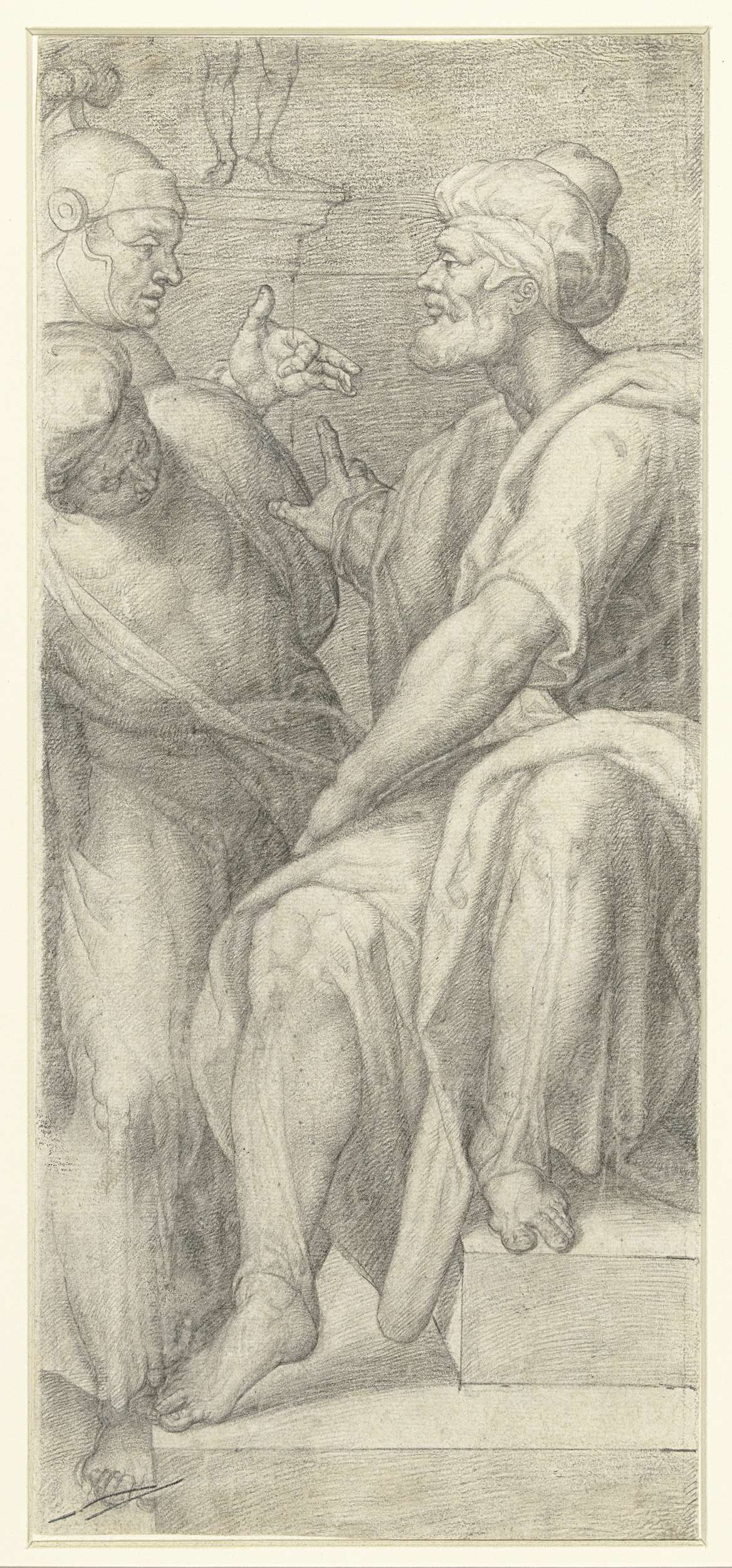 Romeinse soldaat spreekt met een man met een tulband over een gevangene.