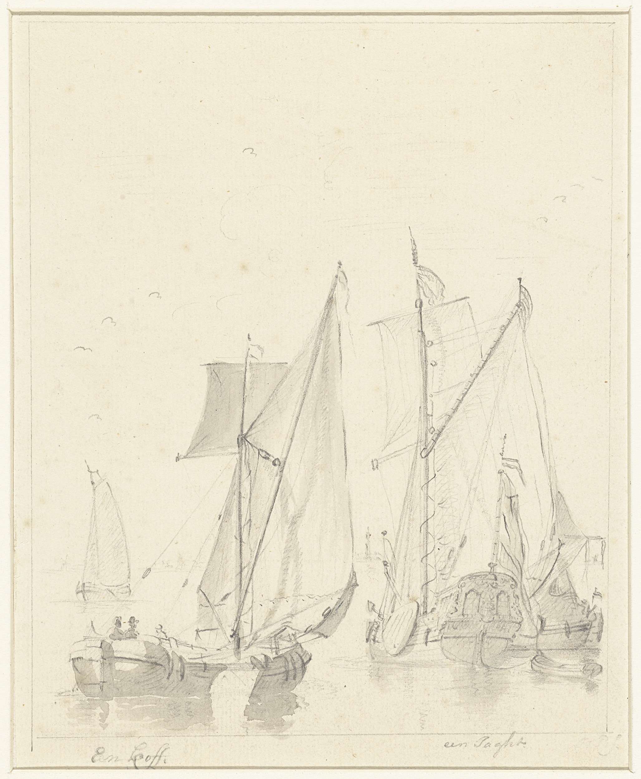 Twee voorstellingen van schepen; boven: drie haringbuizen; onder: een sloep.