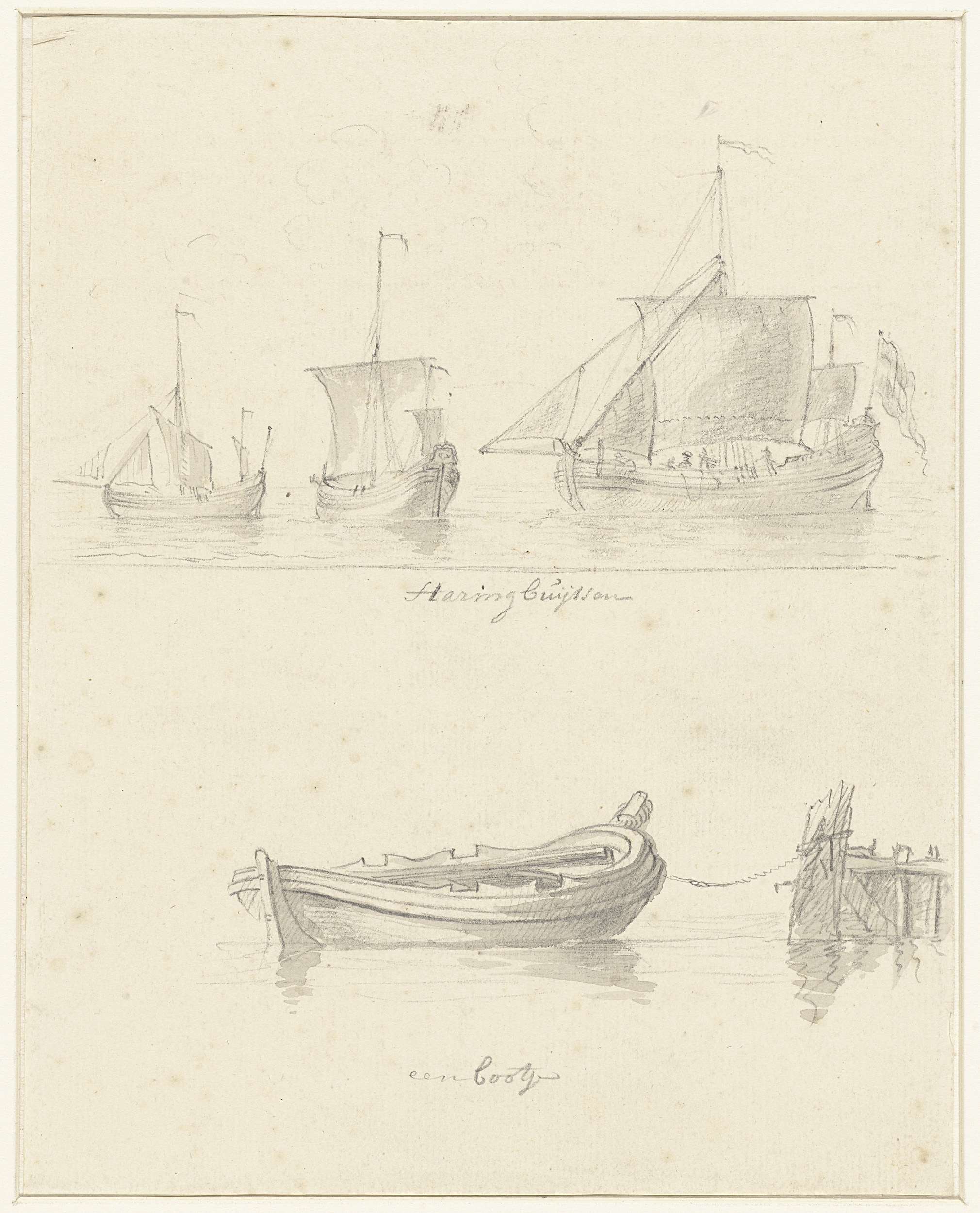 Twee voorstellingen van schepen; boven: drie haringbuizen; onder: een sloep.