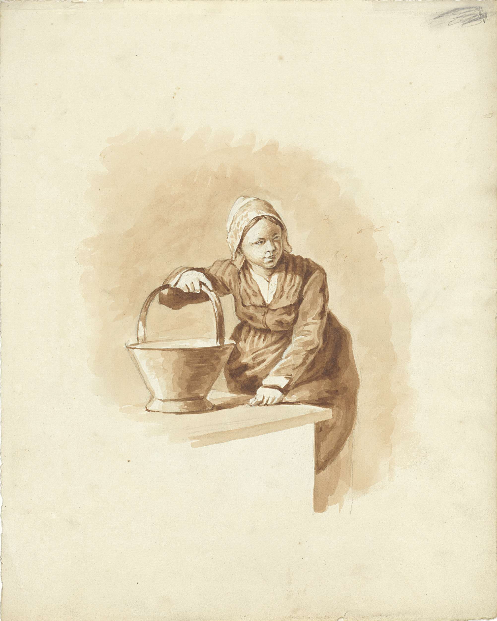 Meisje met emmer staande bij een tafel
